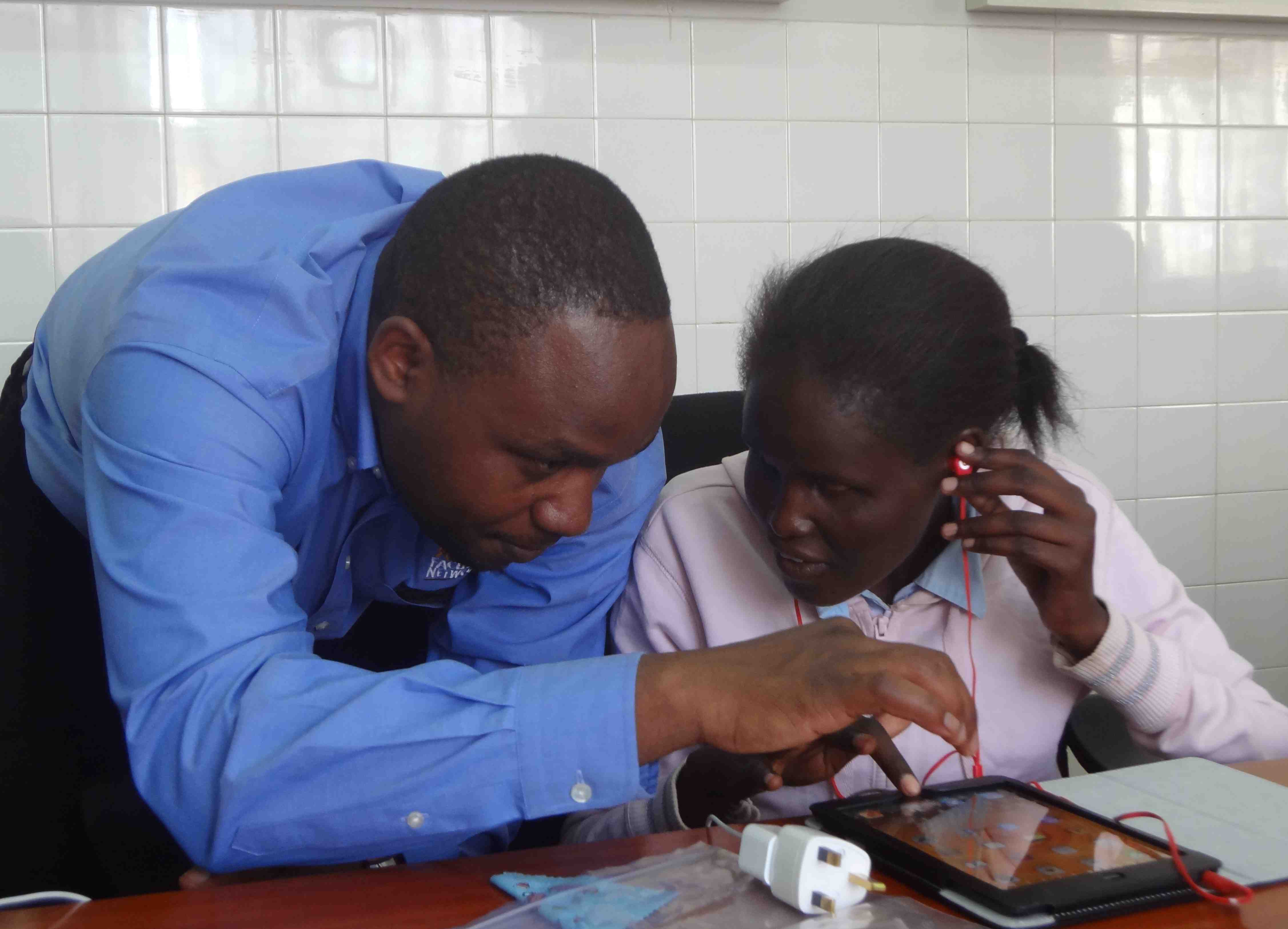 CaptionSammy helping Hellen and Samson learn how to use an iPad