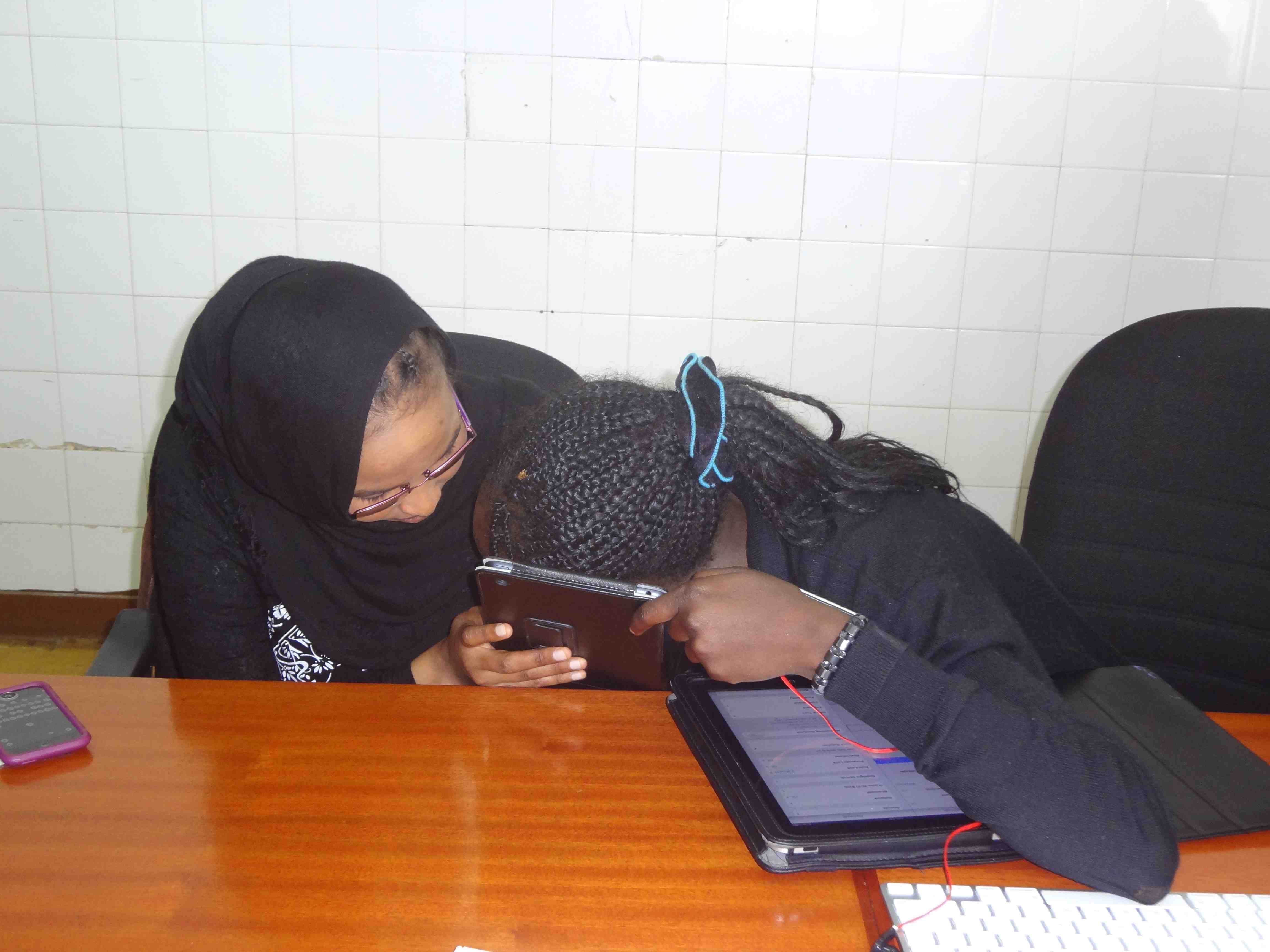 CaptionFatuma and Hellen listening to the VoiceOver feature on an iPad