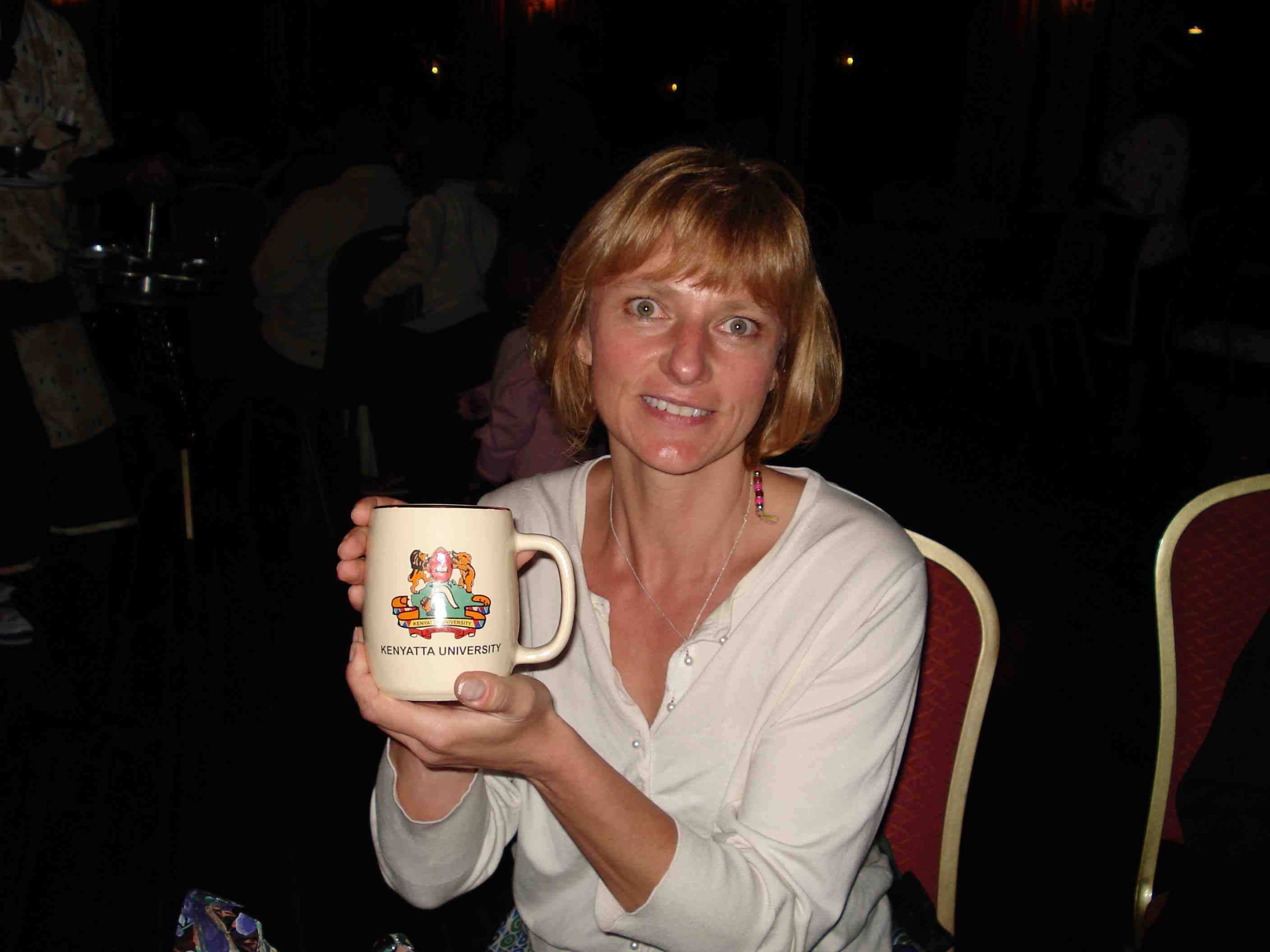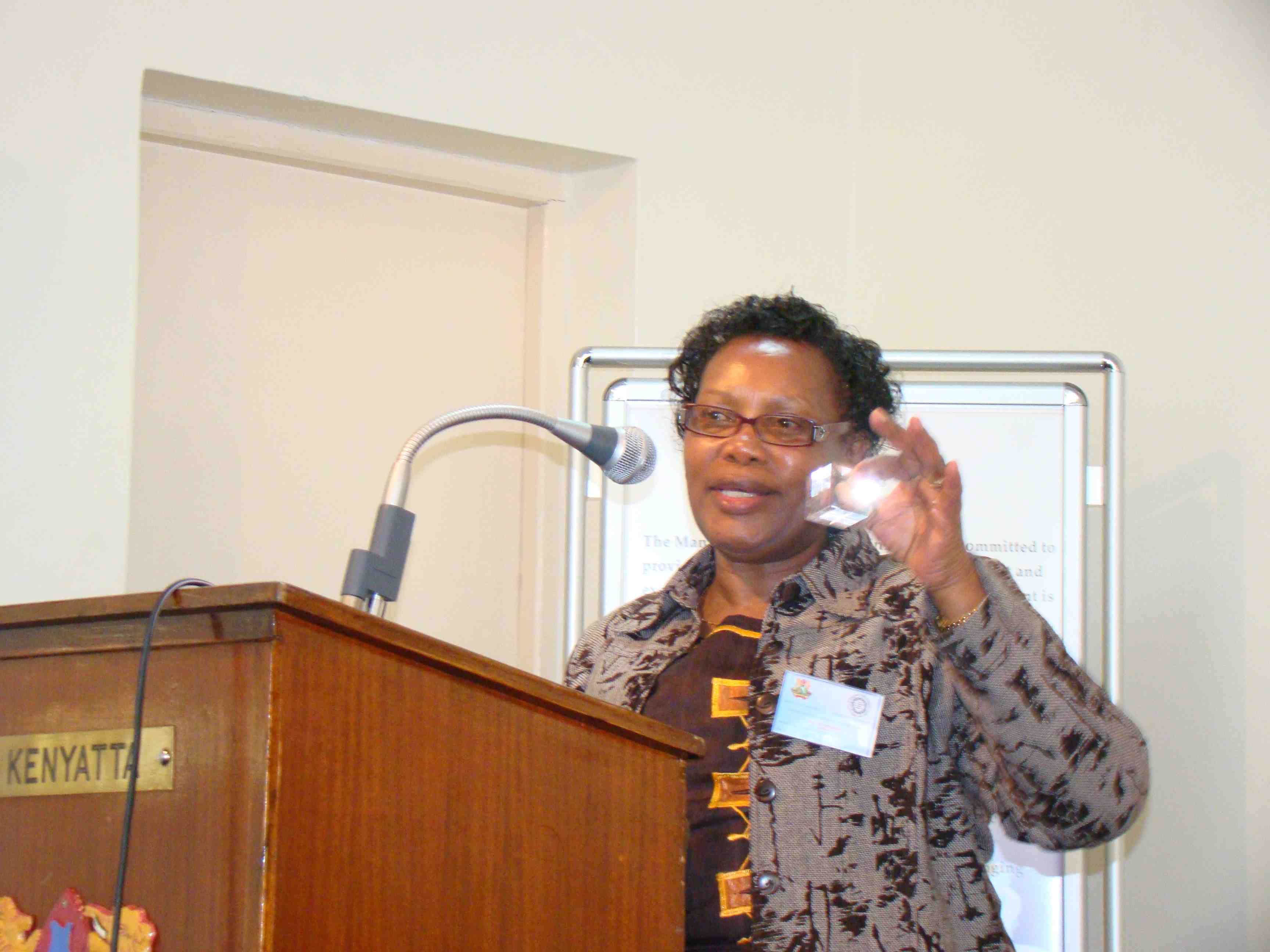 Agnes Gathumbi displays one of the SU SOE paperweights