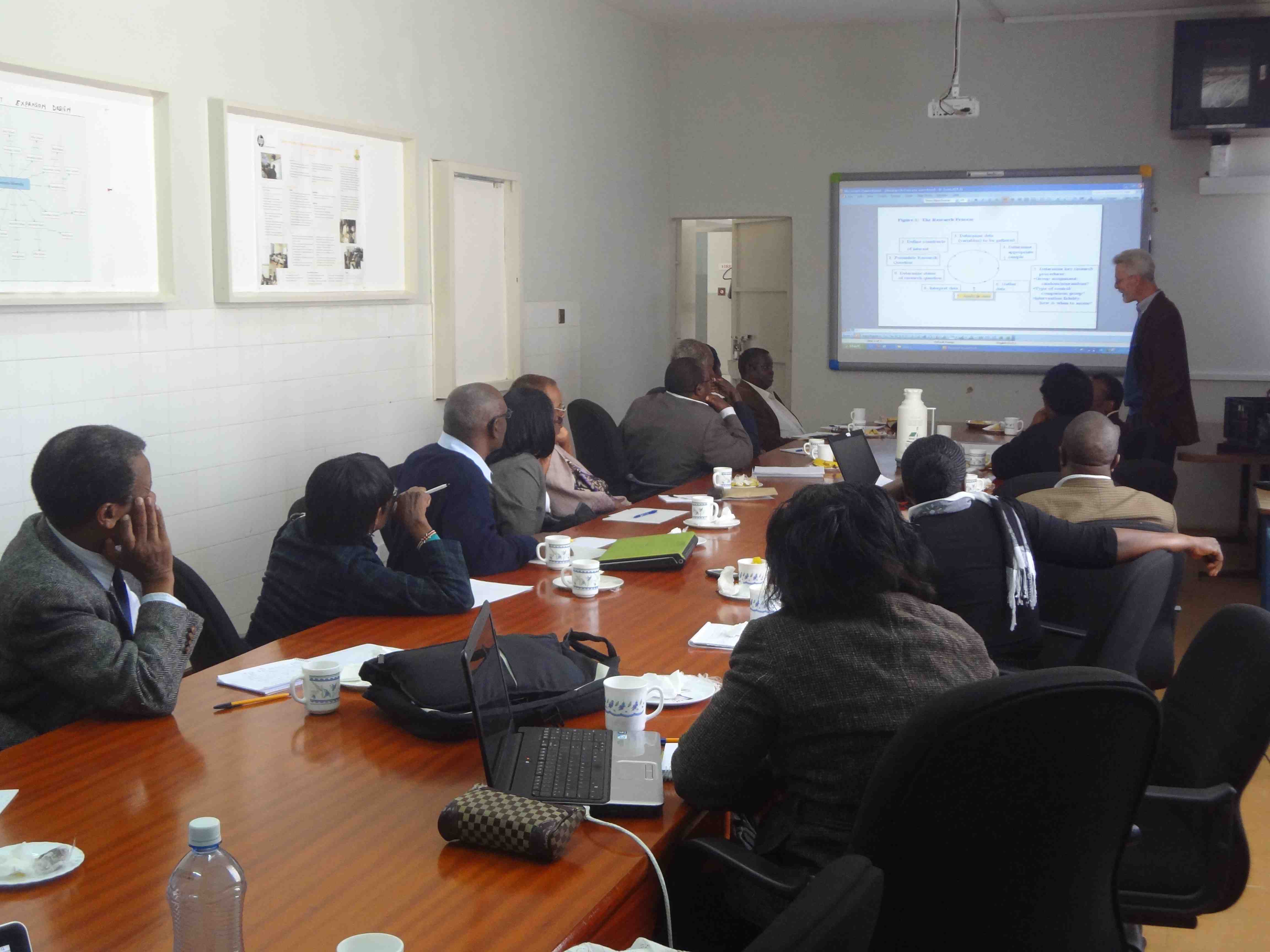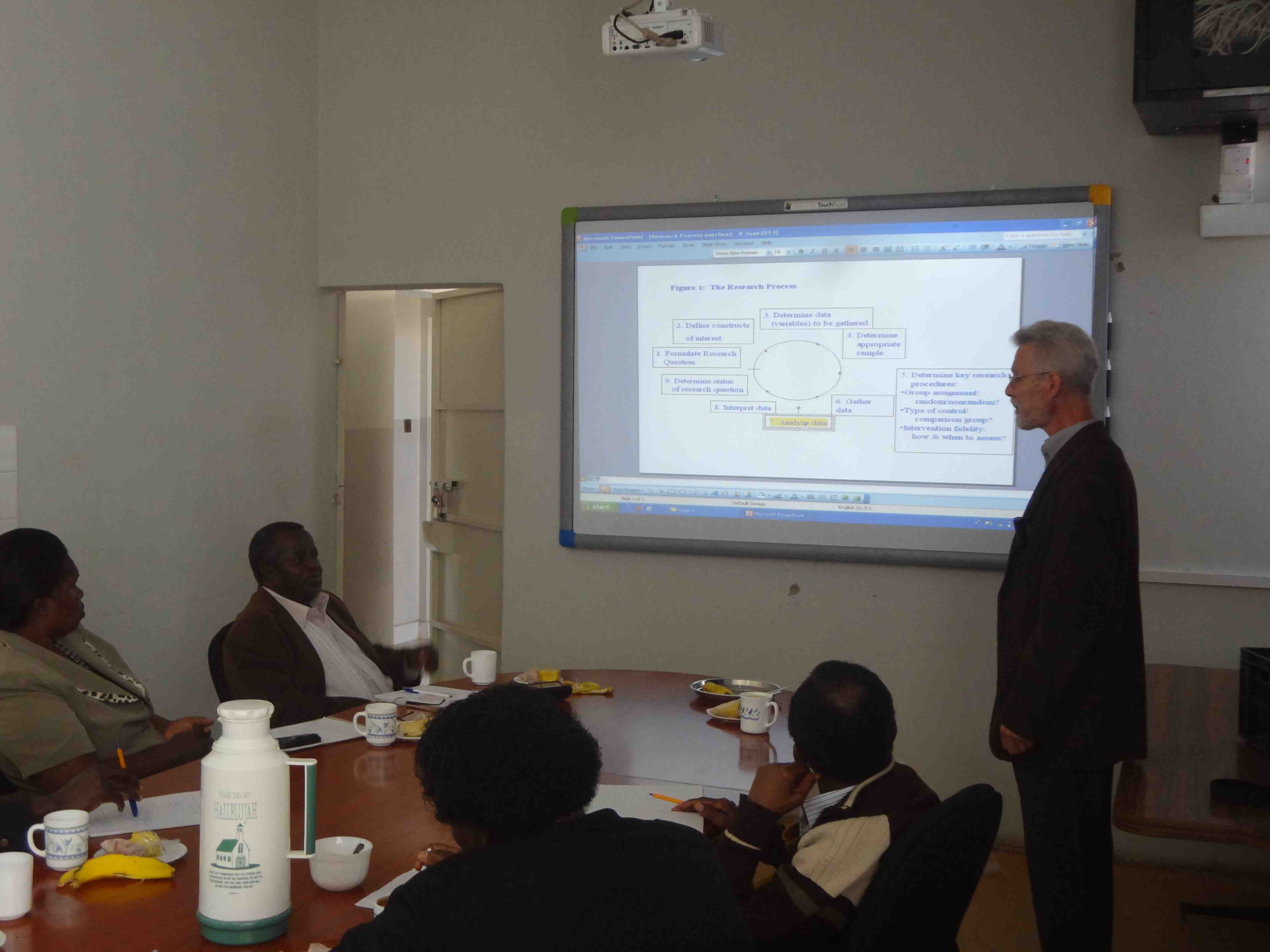 During the mornings of July 8-9, 2013, Prof. Jim Bellini, a professor in the Department of Counseling and Human Services at Syracuse University, led faculty members and graduate students in the Department of Educational Communication and Technology at Kenyatta University in a workshop on research design. Jim led an examination of principles of research design during the first morning and facilitated a discussion of several proposed research projects brought by faculty members and graduate students during the second morning.