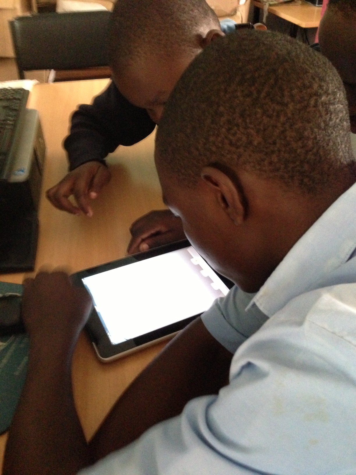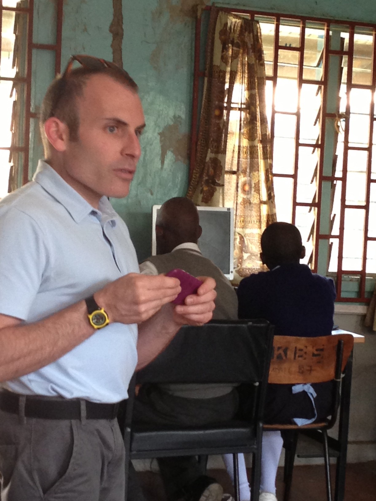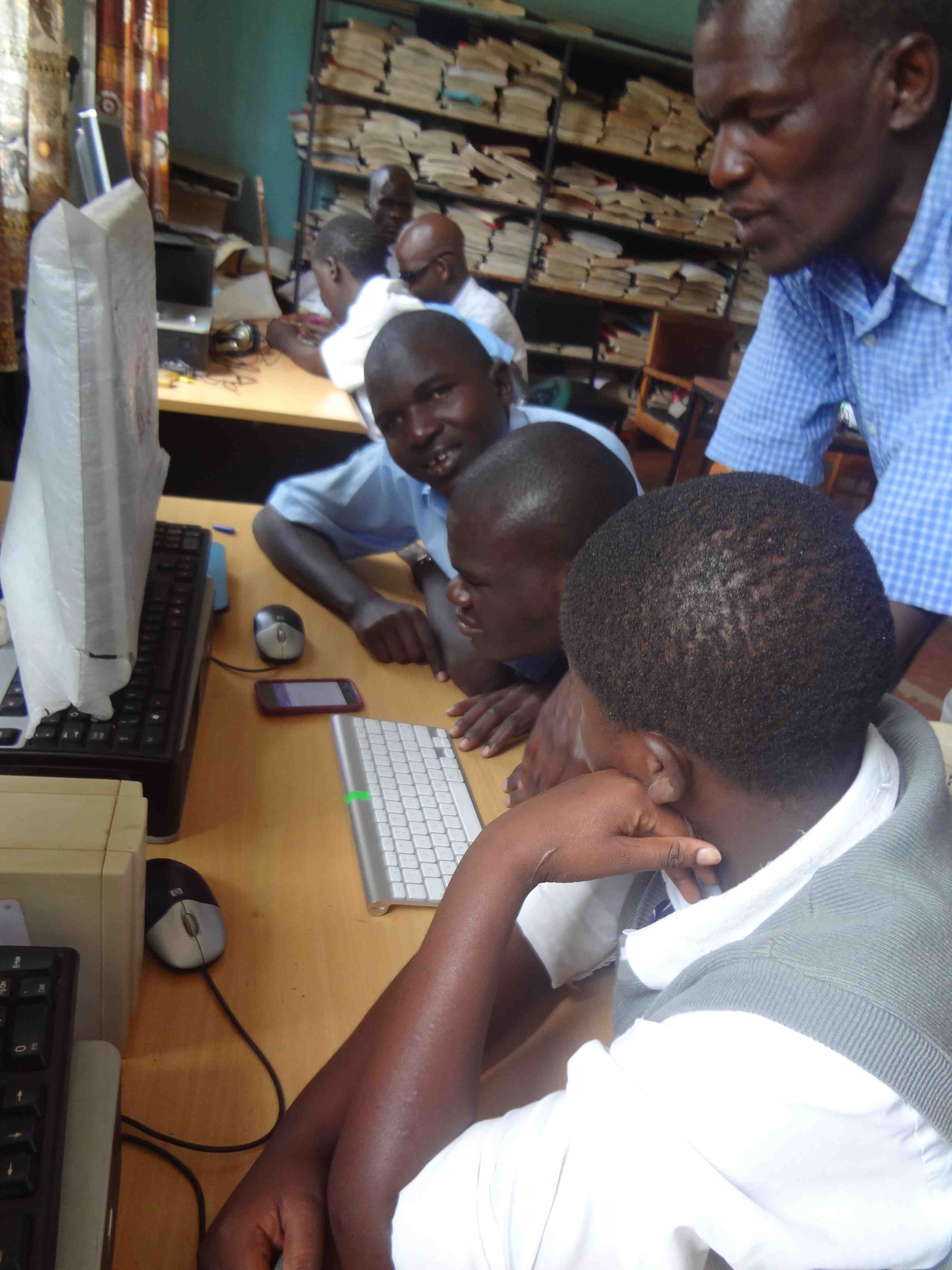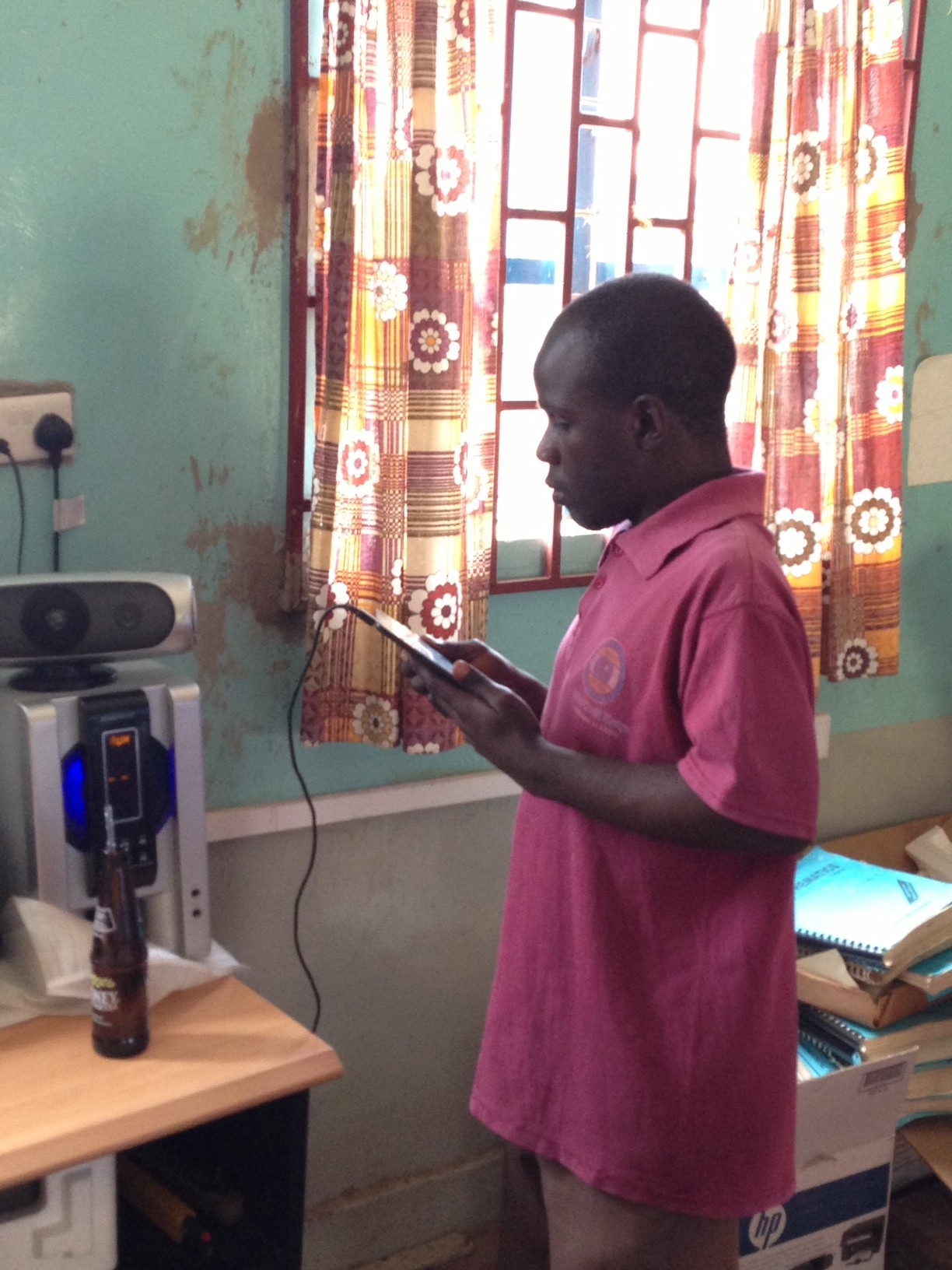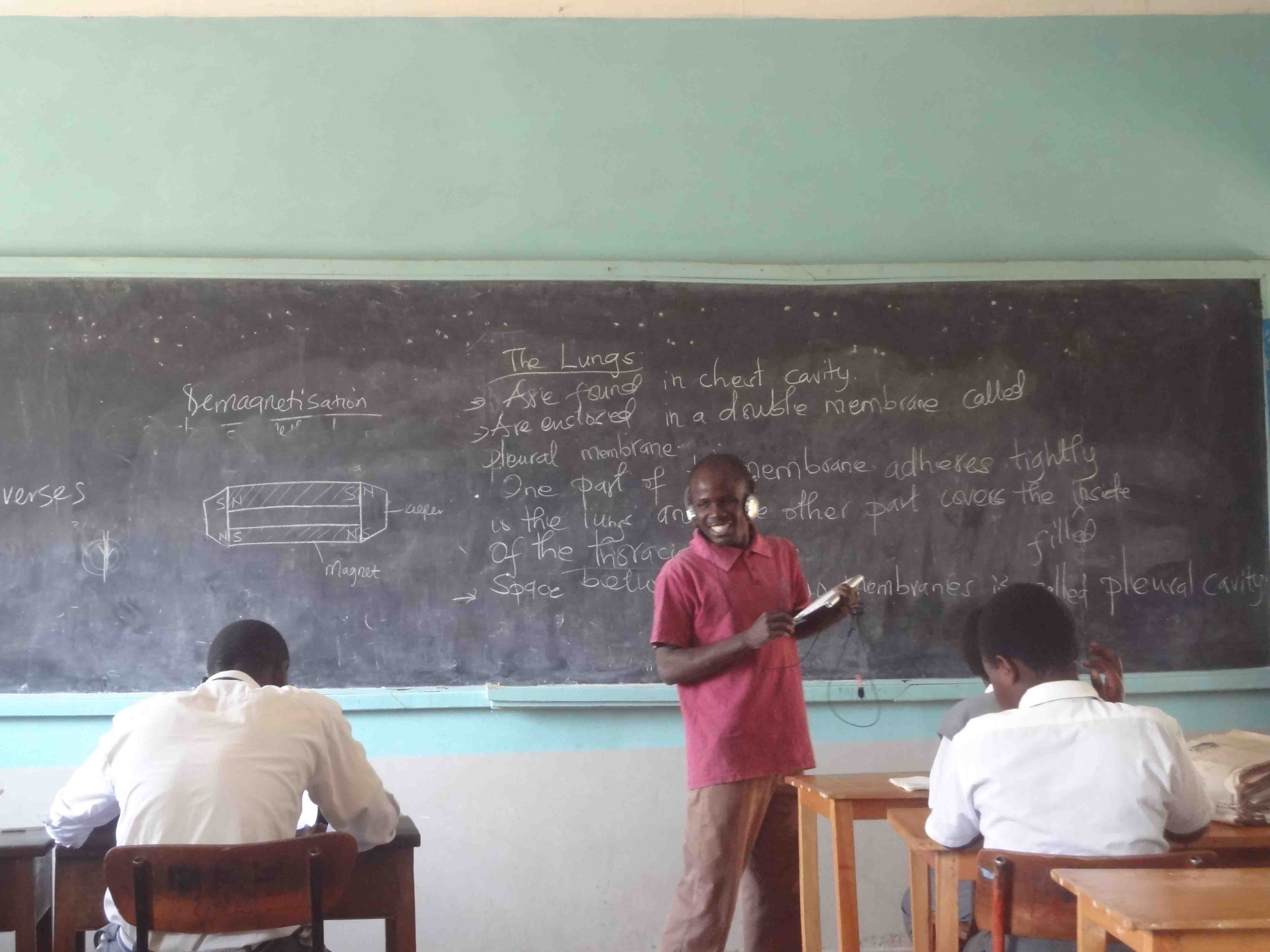 The primary school head teacher and other teachers were shown the equipment and then about 20 students worked with five iOS devices with keyboards to learn some of the capability. Three iPods and one iPad were donated to Kibos to use; the students and teachers were very enthusiastic and are hoping for more equipment to increase access for students to print and written communication. The group also watched Sammy teach a history lesson using his iPad mini with notes he had created outside of class and then listened to during the lesson using his earphones and navigating with his keyboard.