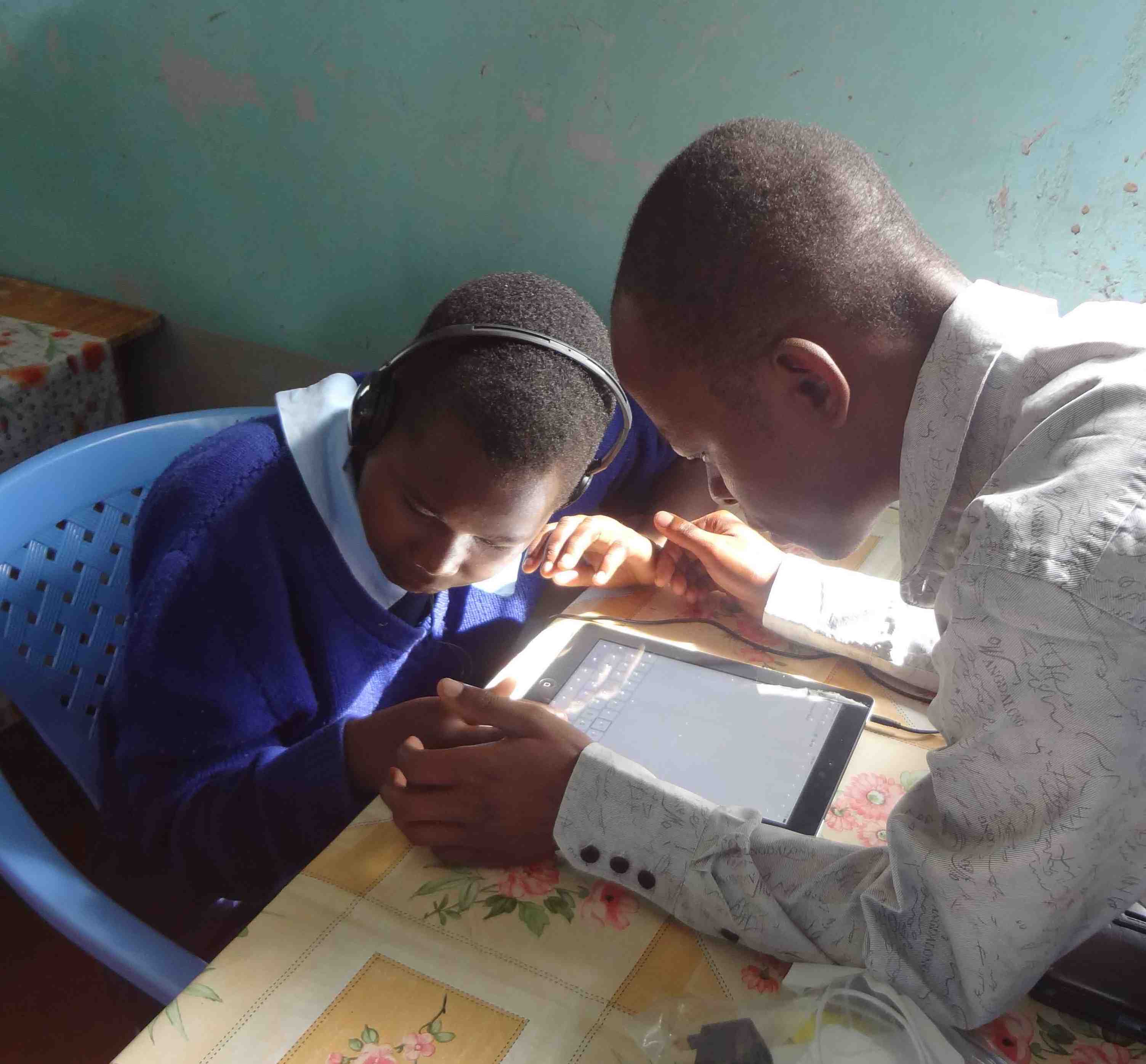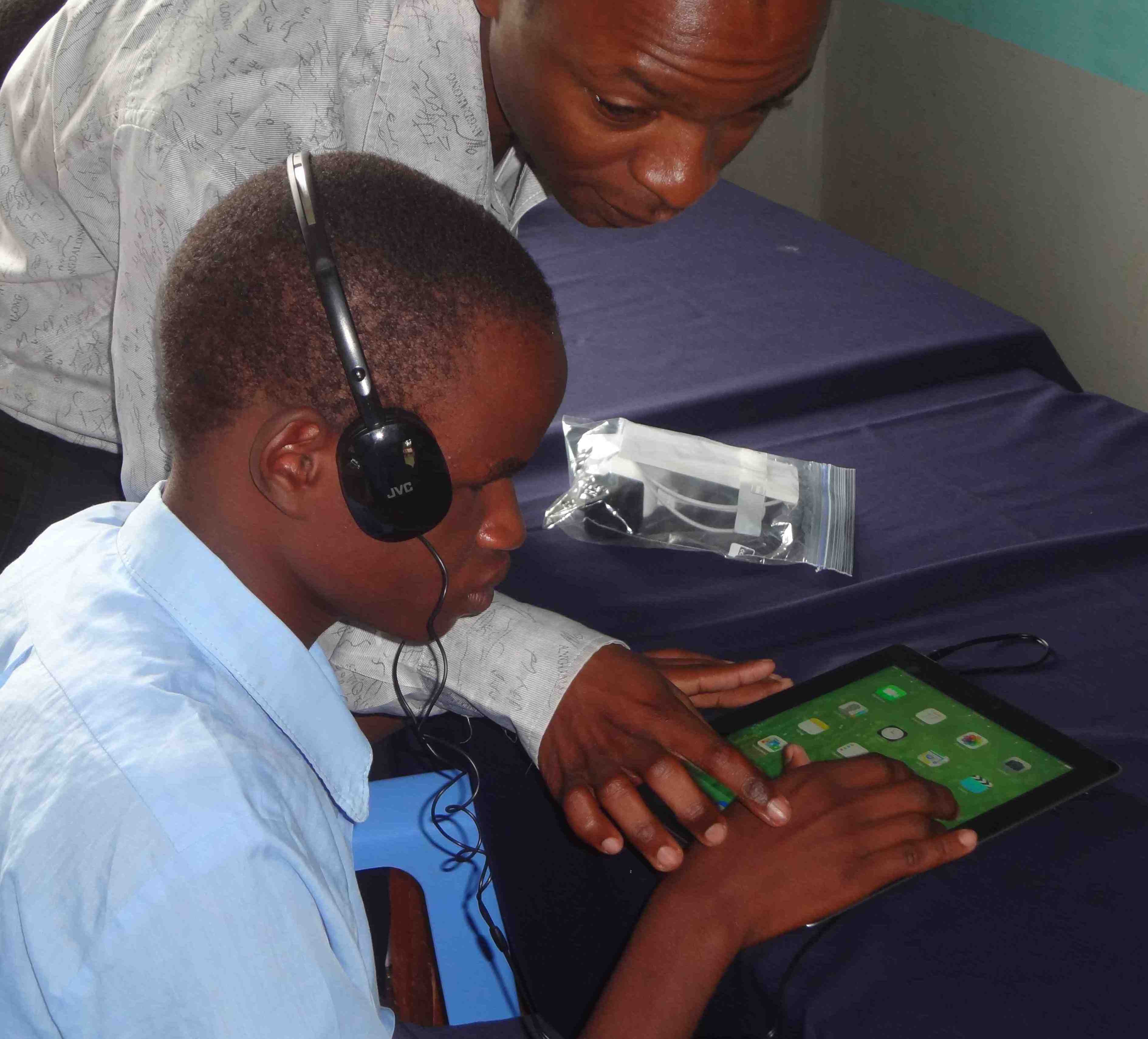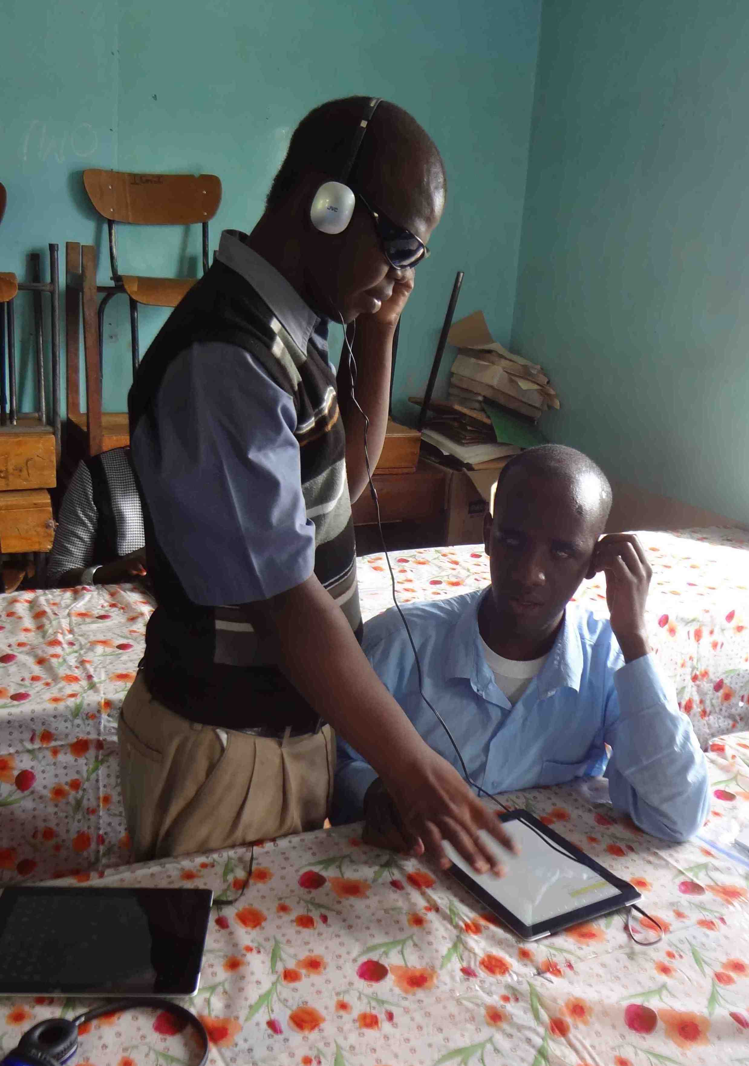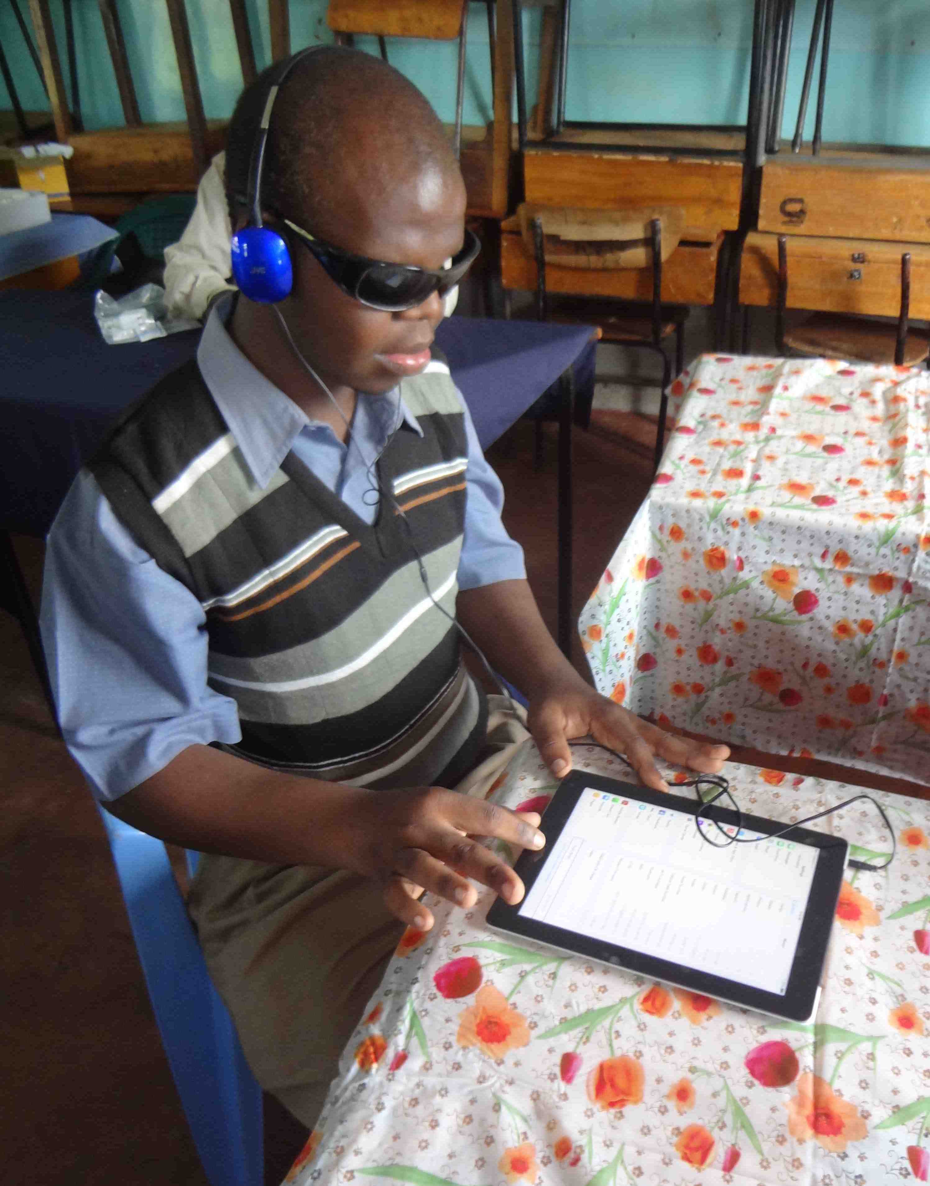 During the all-day training session on basic skills in using VoiceOver (the built-in screen reader on iOS devices), we had two Kenyatta University students (Job and Hellen) who have used iOS devices and keyboards for 1.5 years assist and support students. Additionally, Mandela, who graduated from Kibos last year and who we worked with last July and is now a university student at Maseno University, helped out.