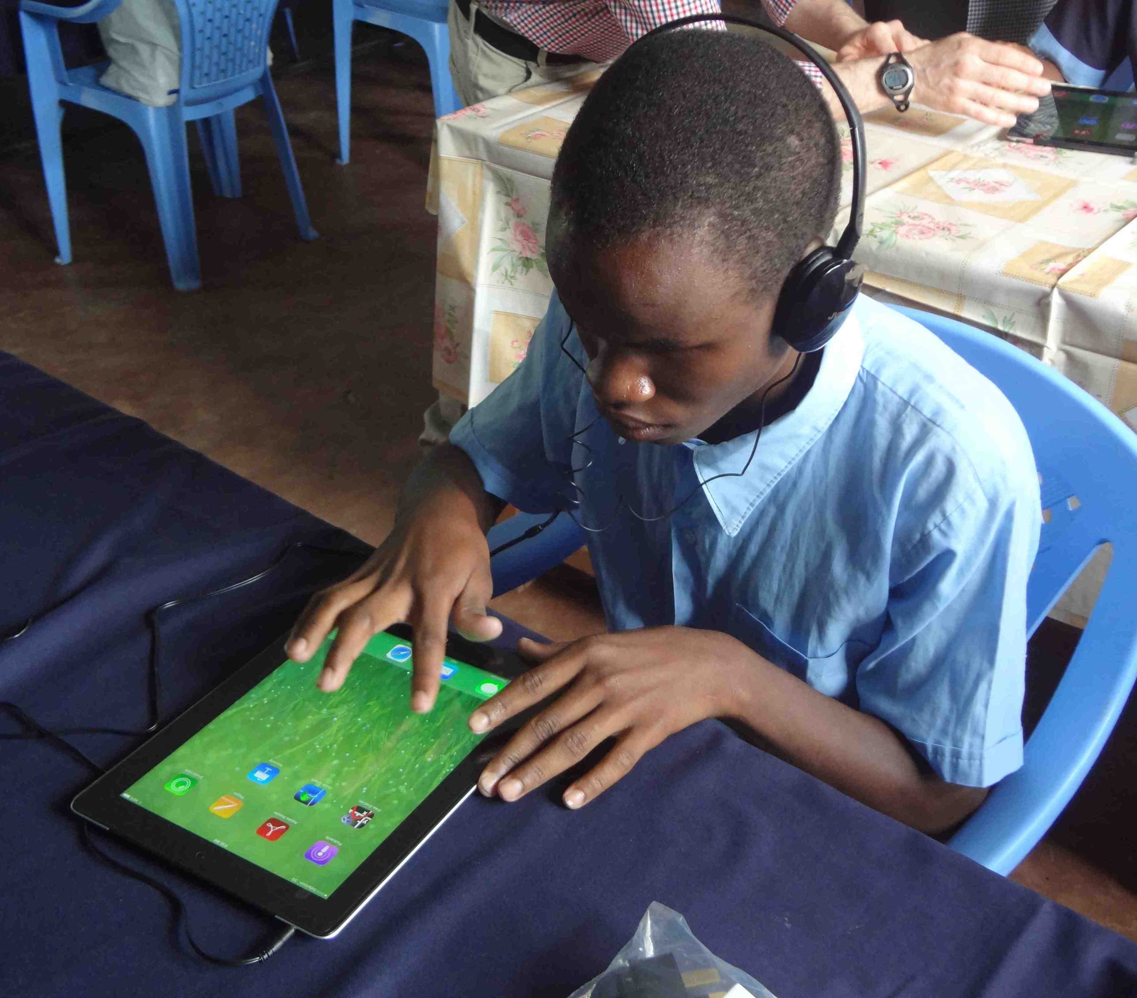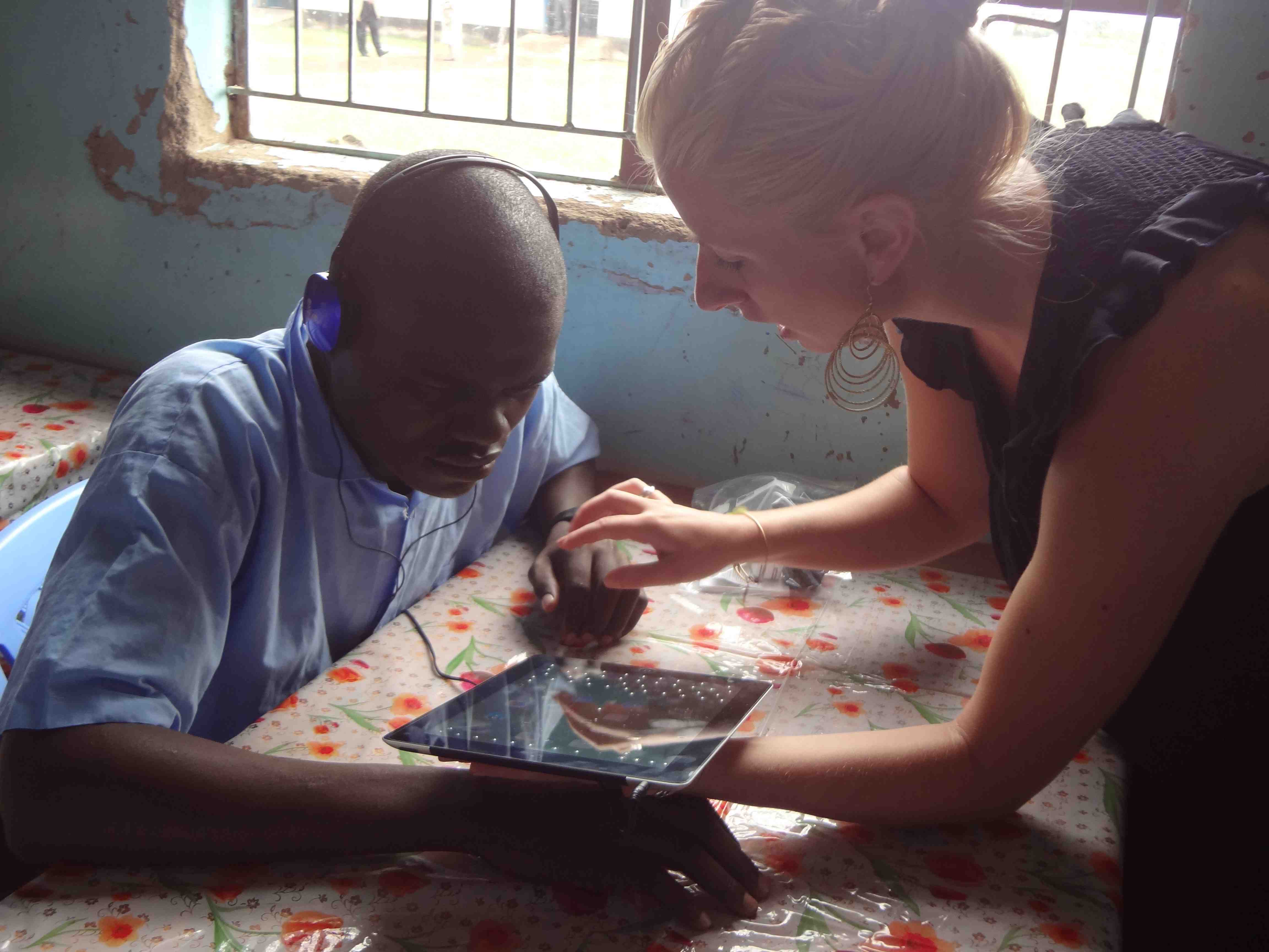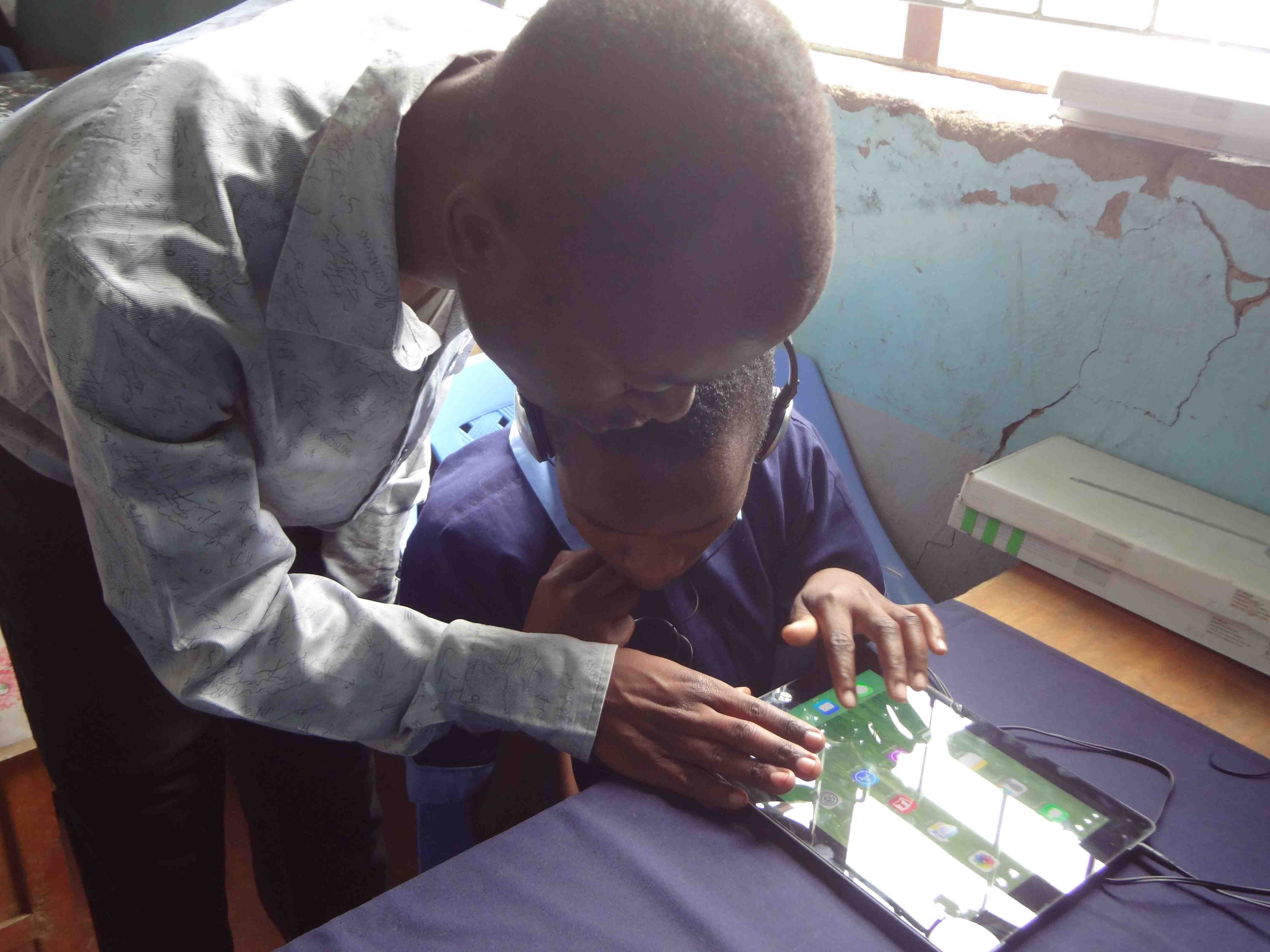 During the all-day training session on basic skills in using VoiceOver (the built-in screen reader on iOS devices), we had two Kenyatta University students (Job and Hellen) who have used iOS devices and keyboards for 1.5 years assist and support students. Additionally, Mandela, who graduated from Kibos last year and who we worked with last July and is now a university student at Maseno University, helped out.