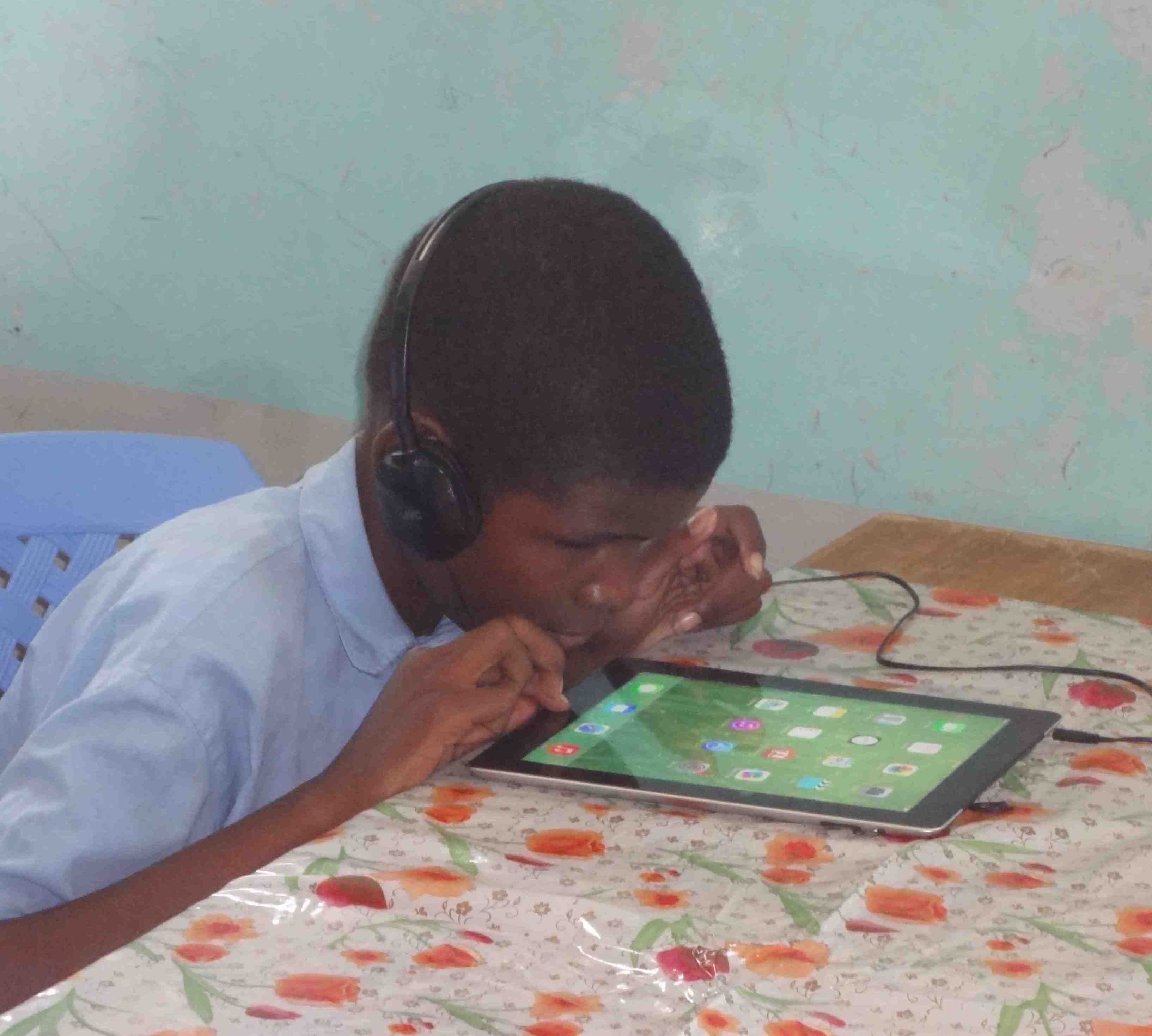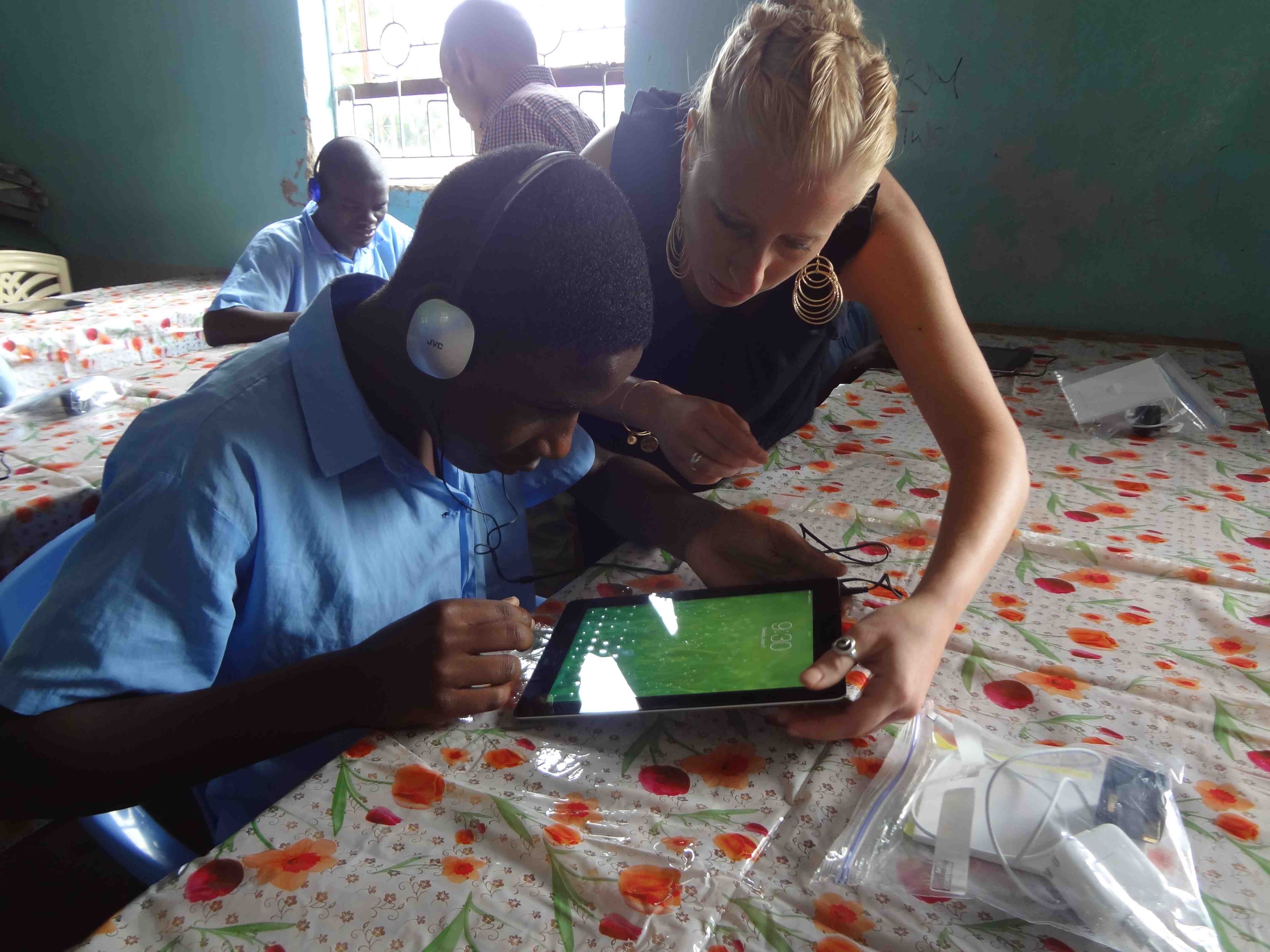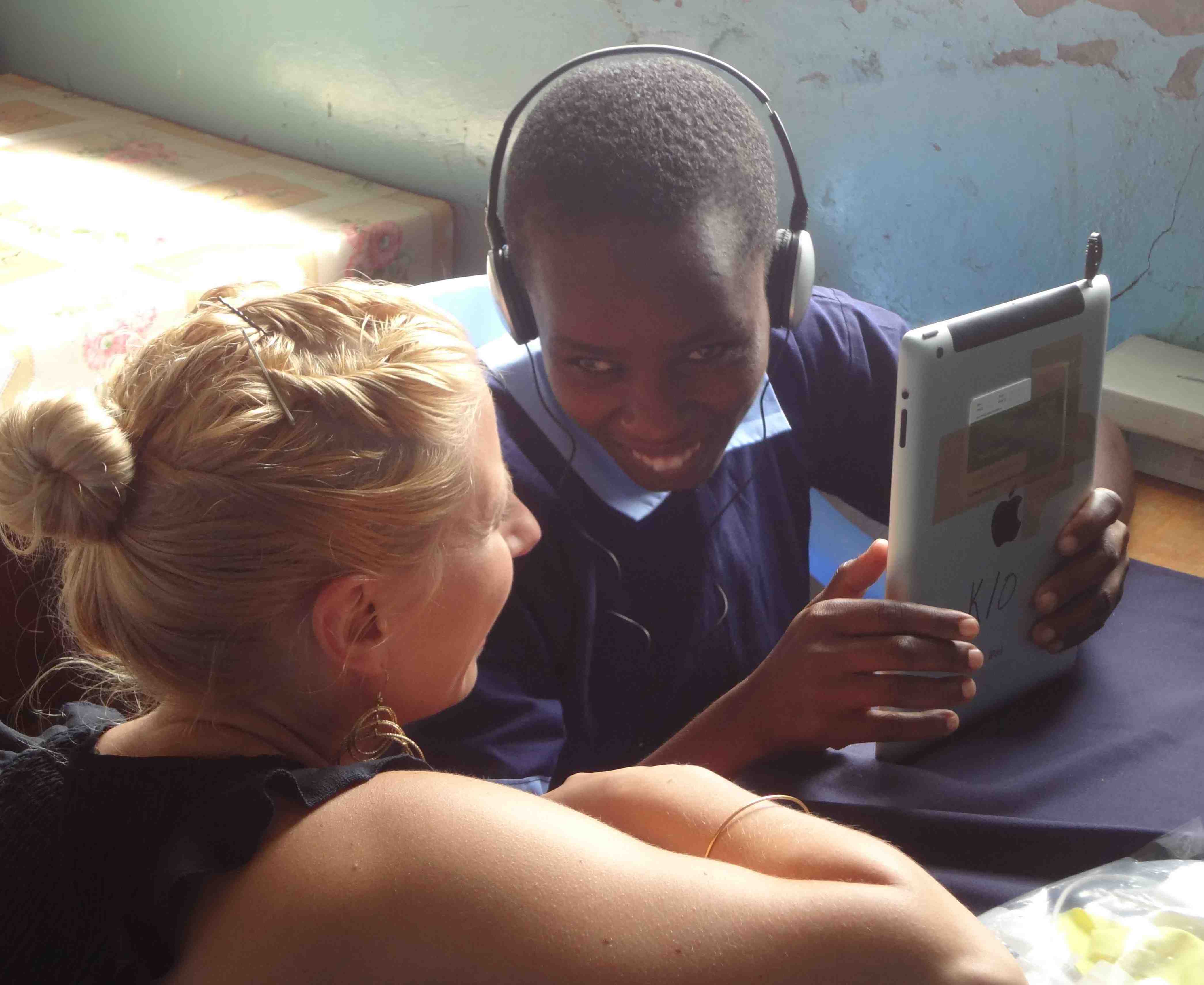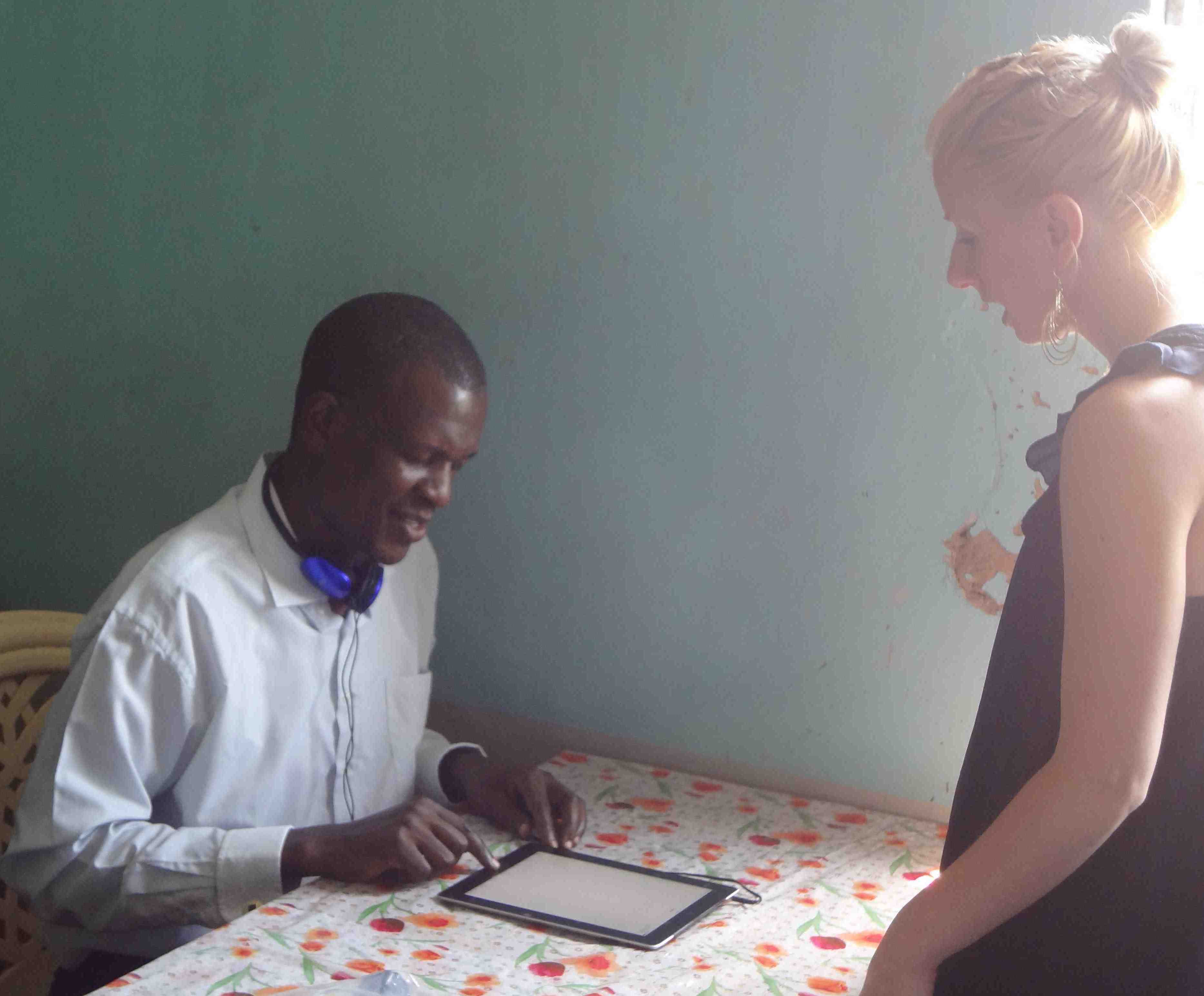 During the all-day training session on basic skills in using VoiceOver (the built-in screen reader on iOS devices), we had two Kenyatta University students (Job and Hellen) who have used iOS devices and keyboards for 1.5 years assist and support students. Additionally, Mandela, who graduated from Kibos last year and who we worked with last July and is now a university student at Maseno University, helped out.