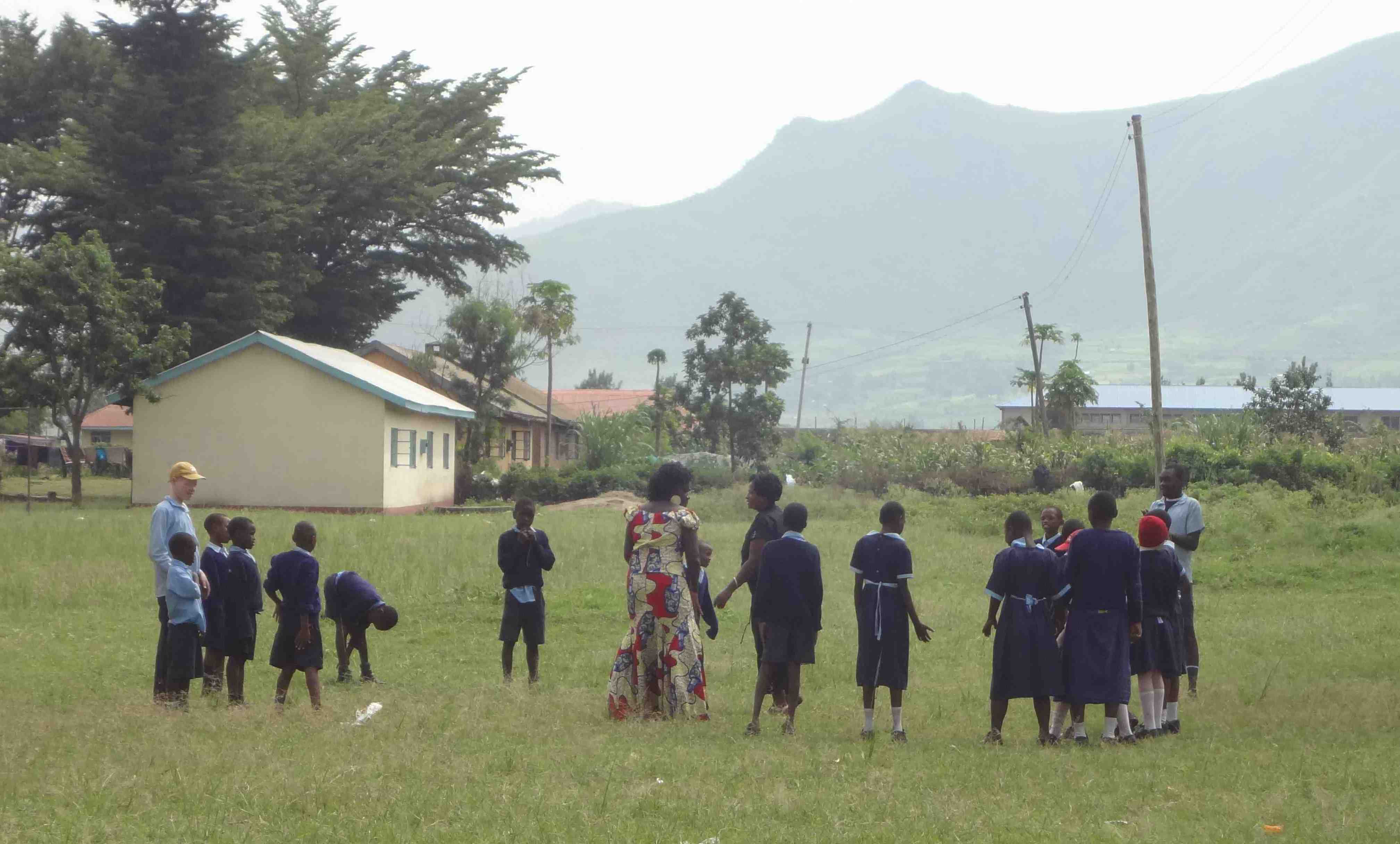 CaptionSeveral teachers lead a group of students in an activity involving singing and movement