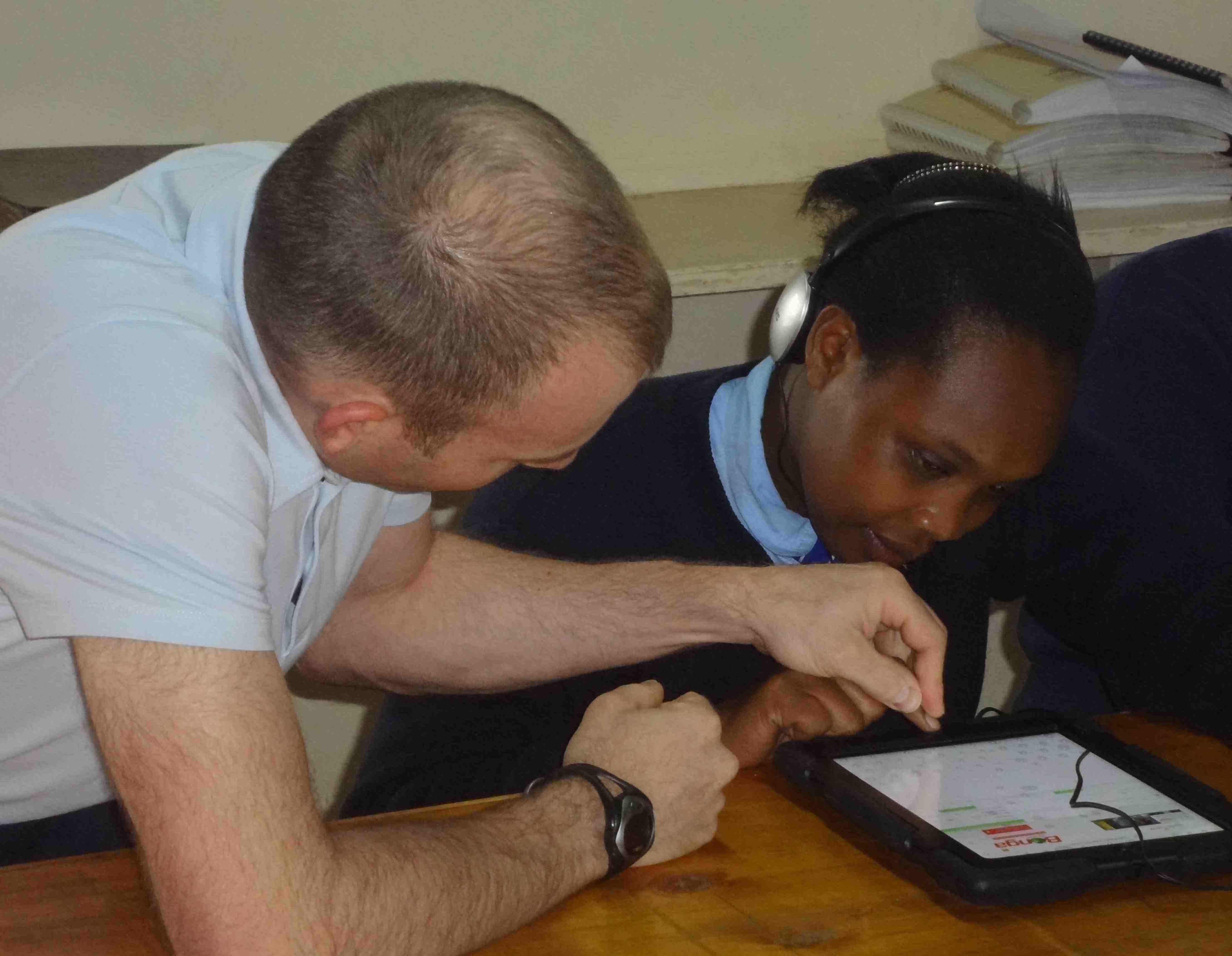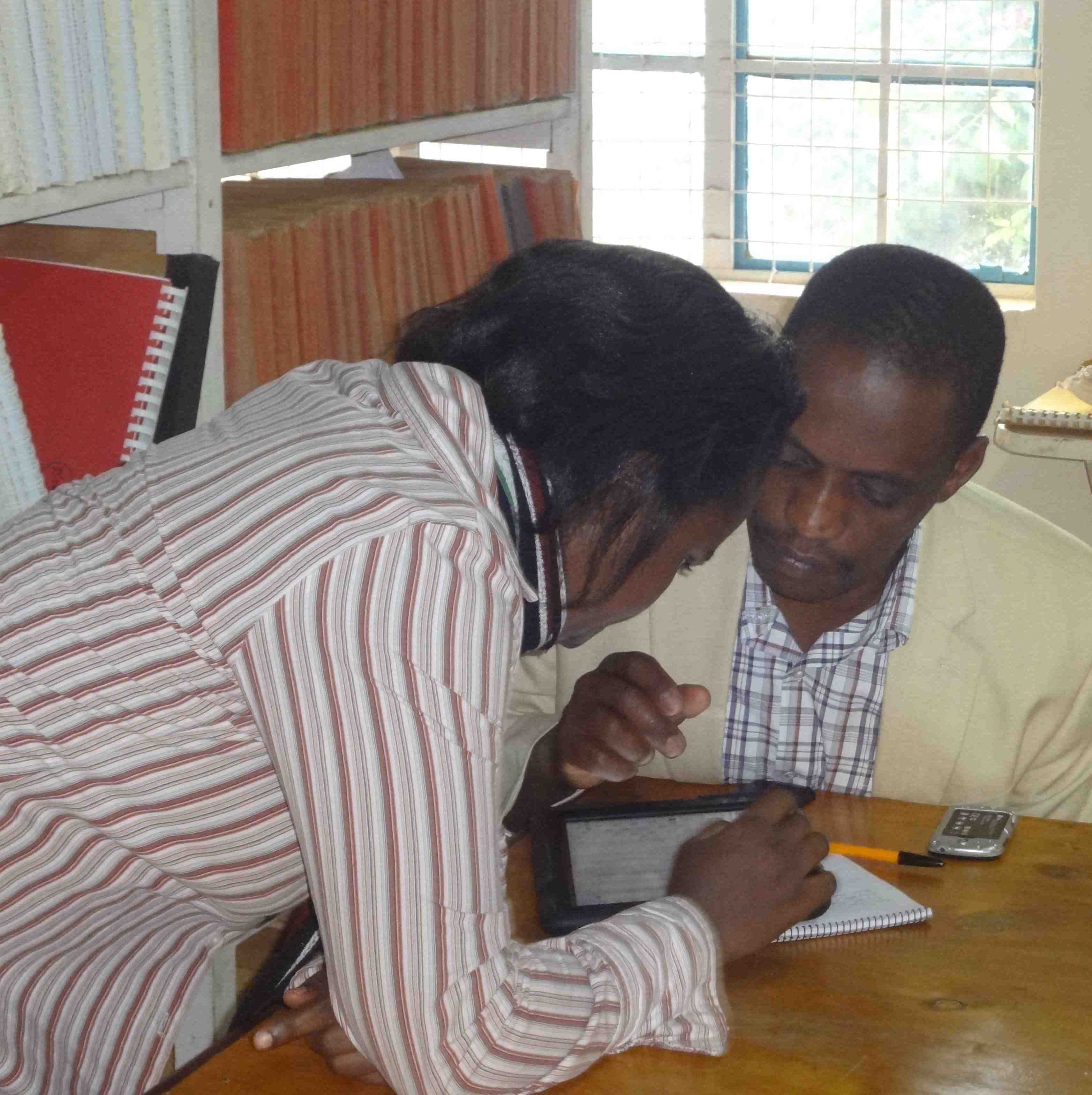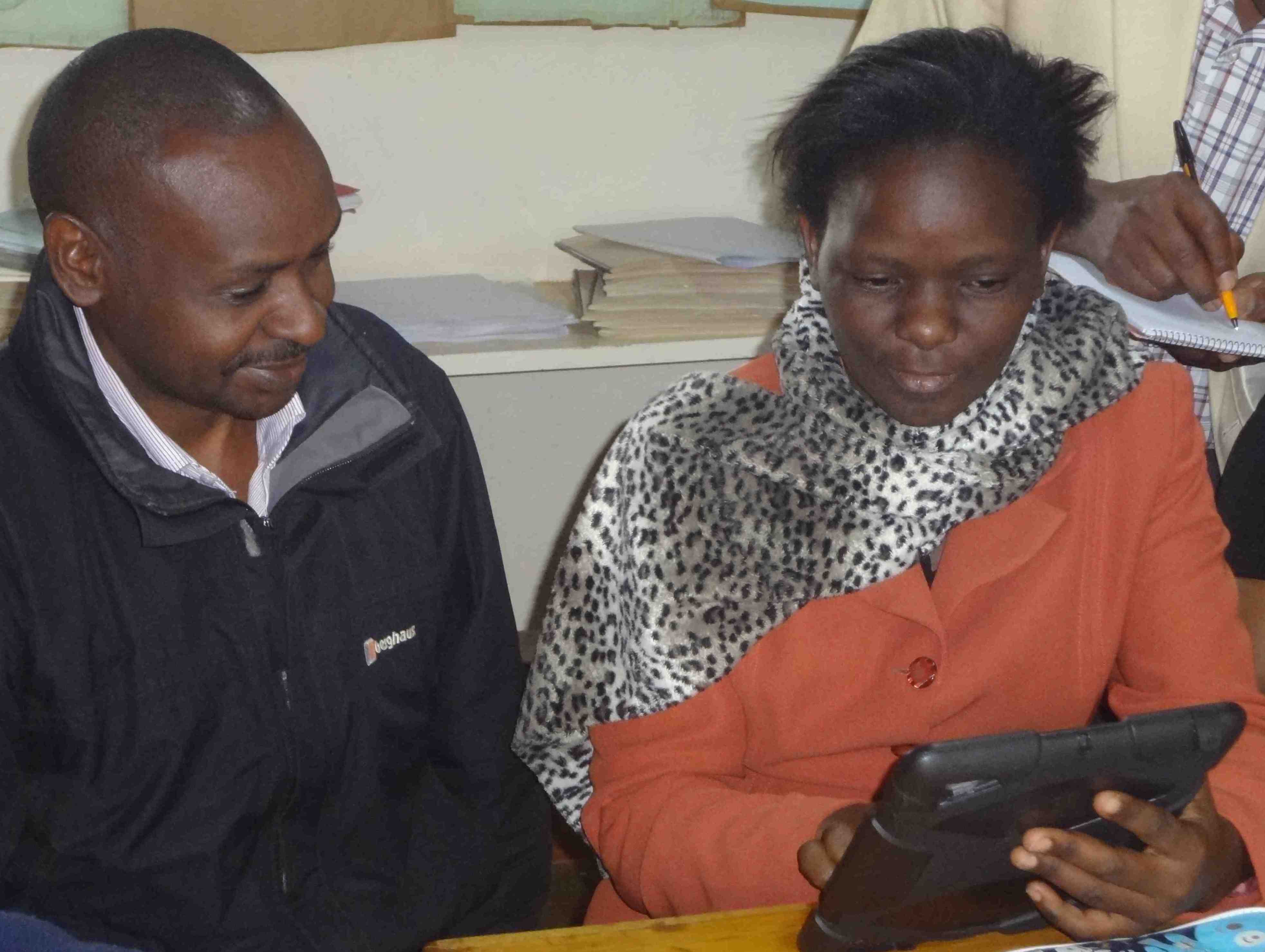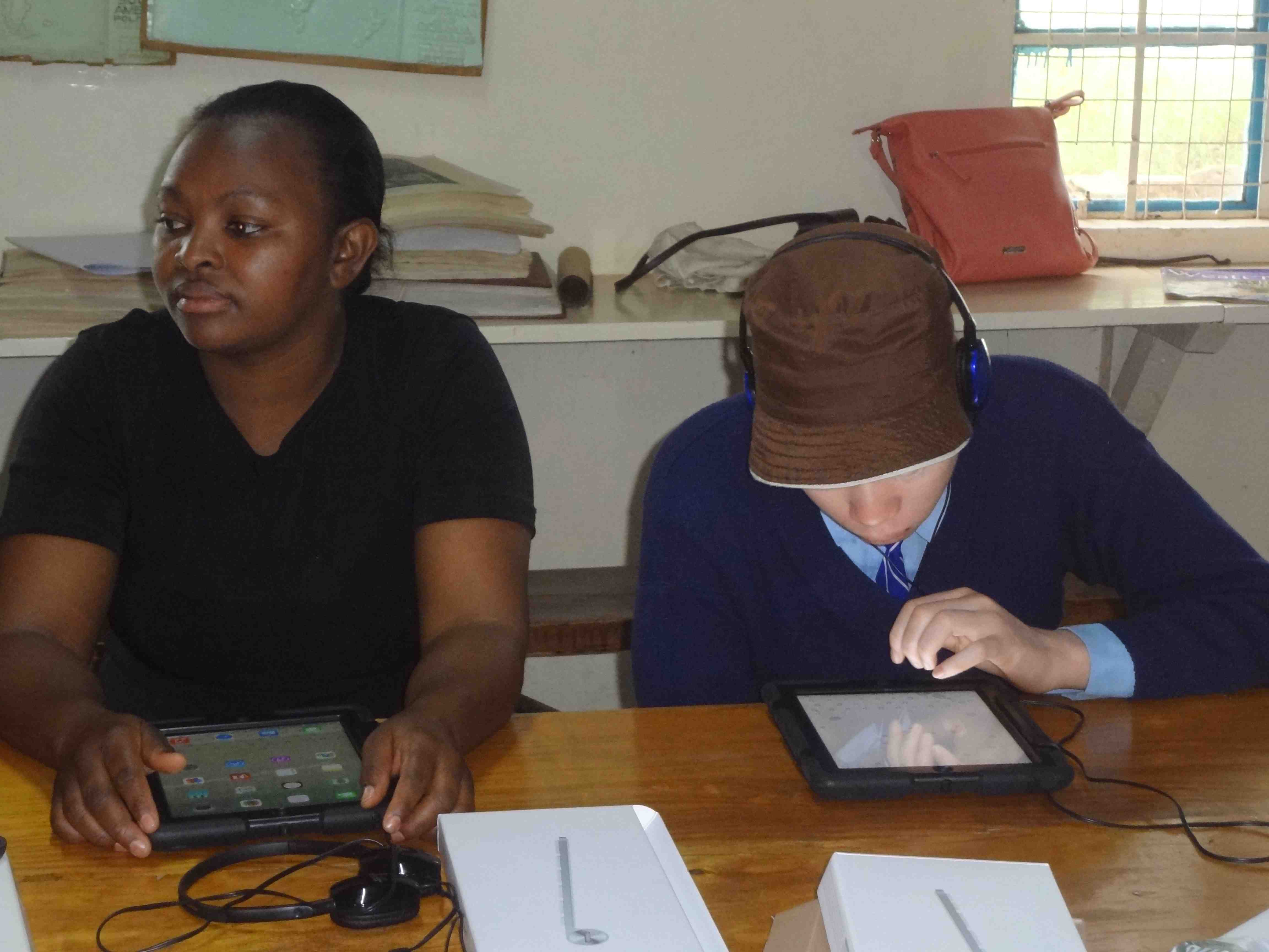 CaptionTwo teachers, Mburu Ngaruiya and Dorothy Ogongo, explore the iPad assistive technology features