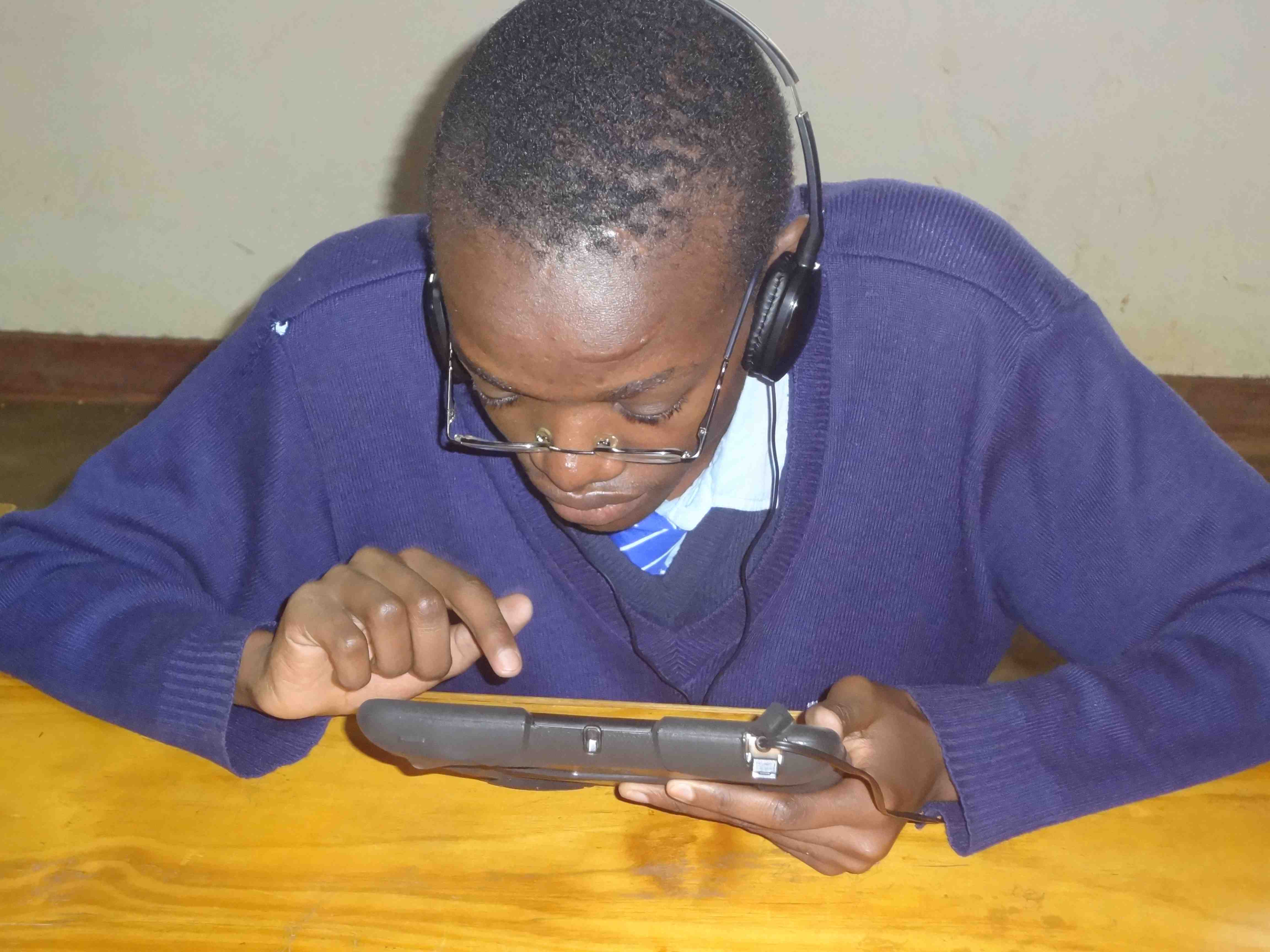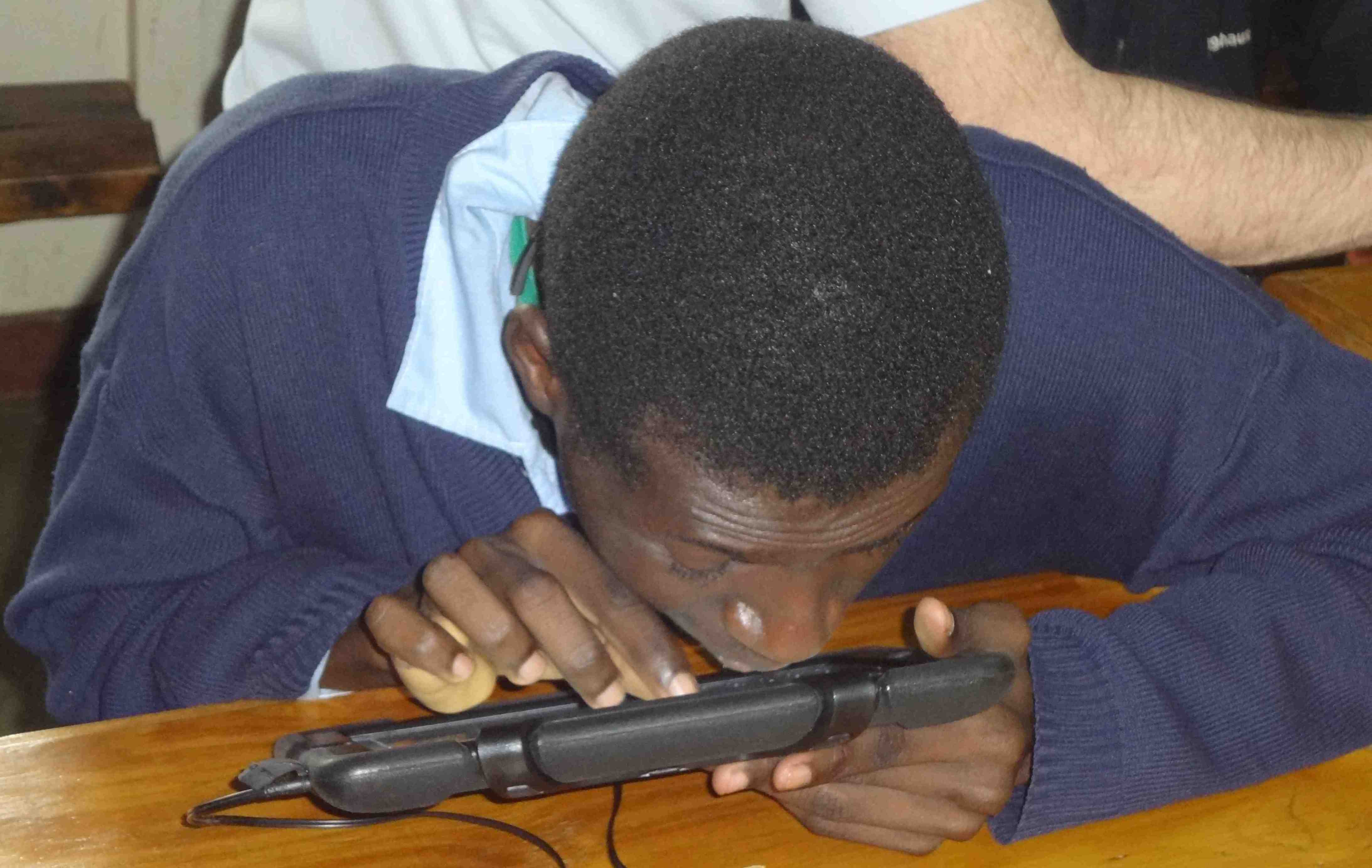 CaptionJoseph Otieno uses the zoom feature to read and write text