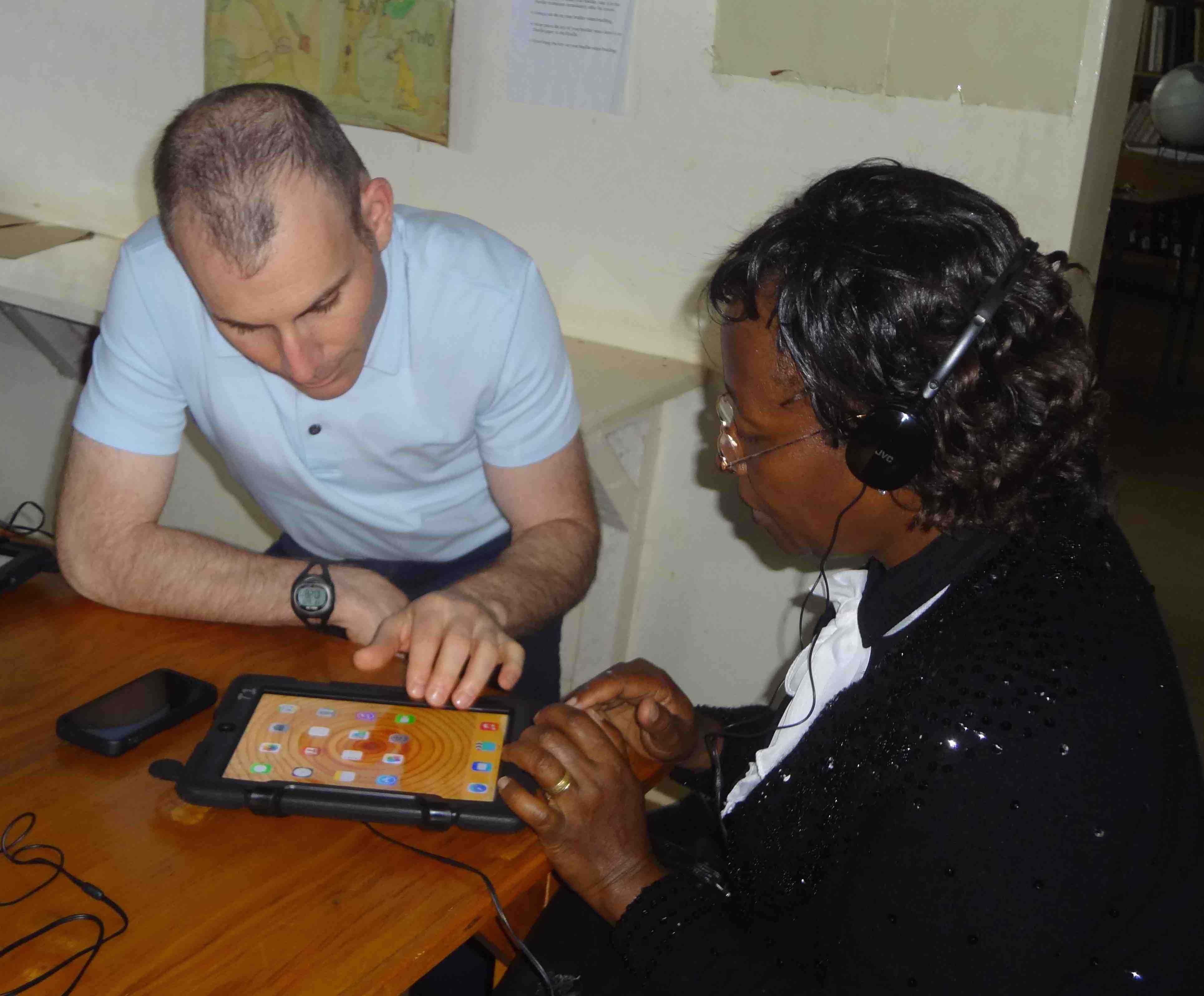 CaptionAlan Foley guides Susan Karari, a teacher, in using VoiceOver commands