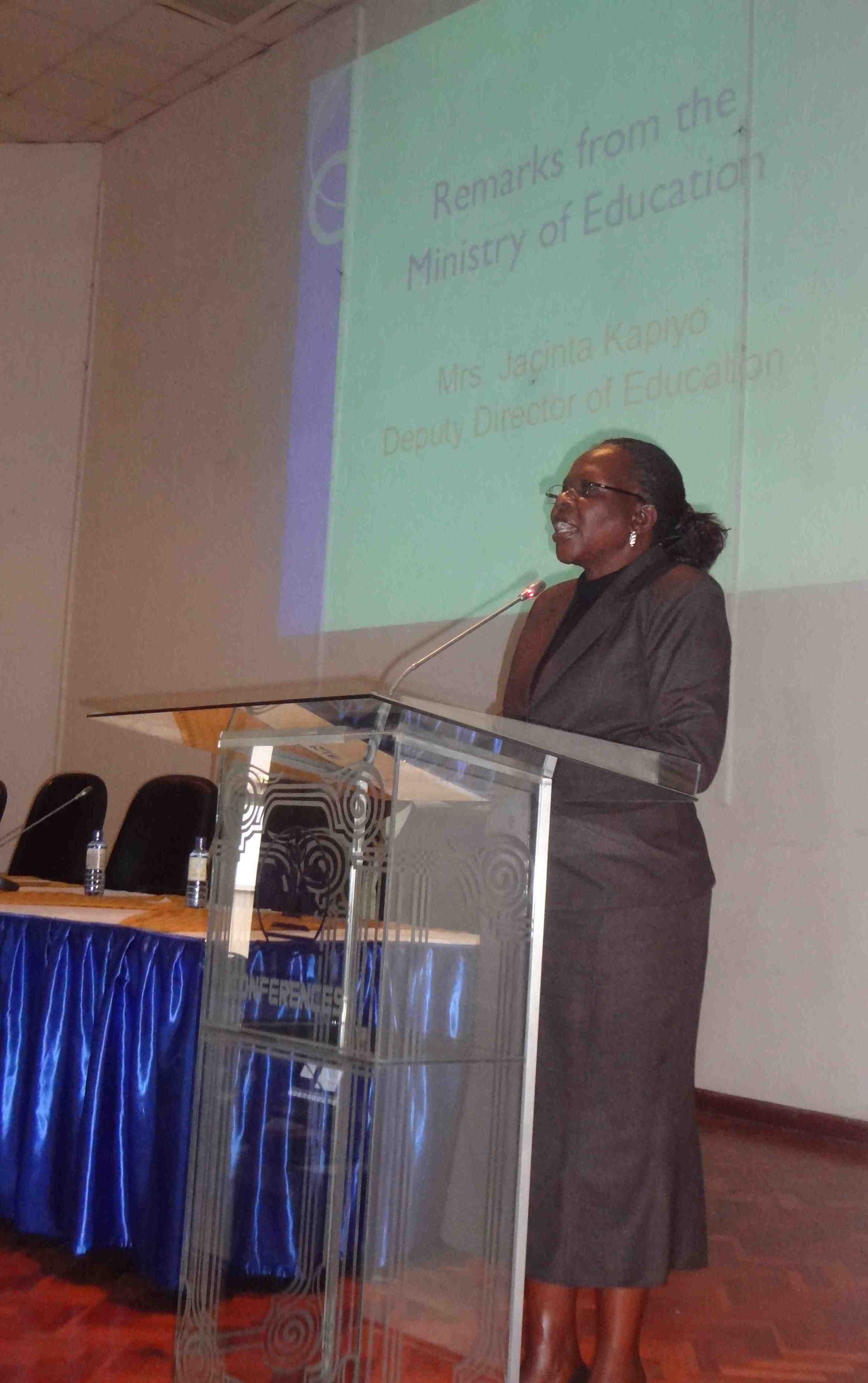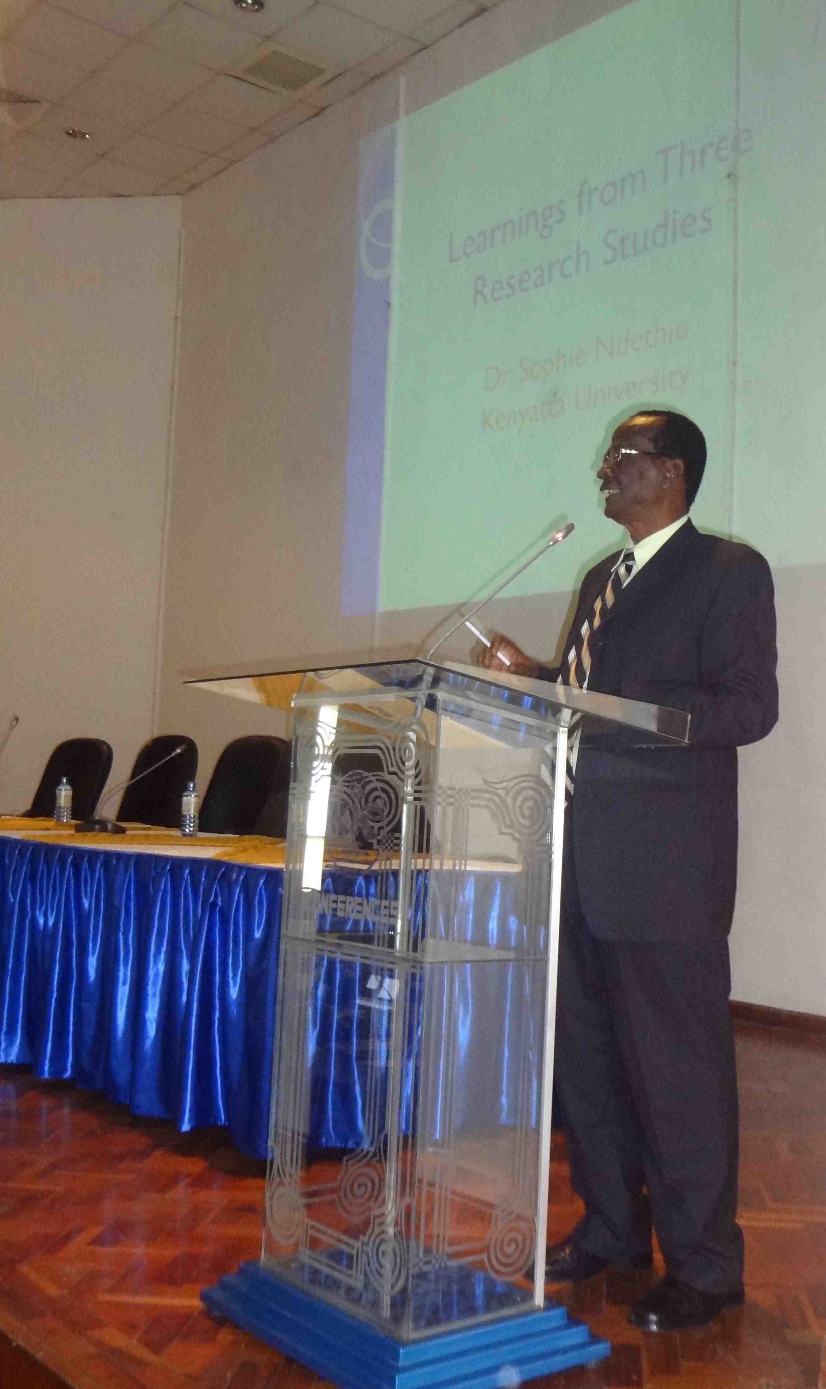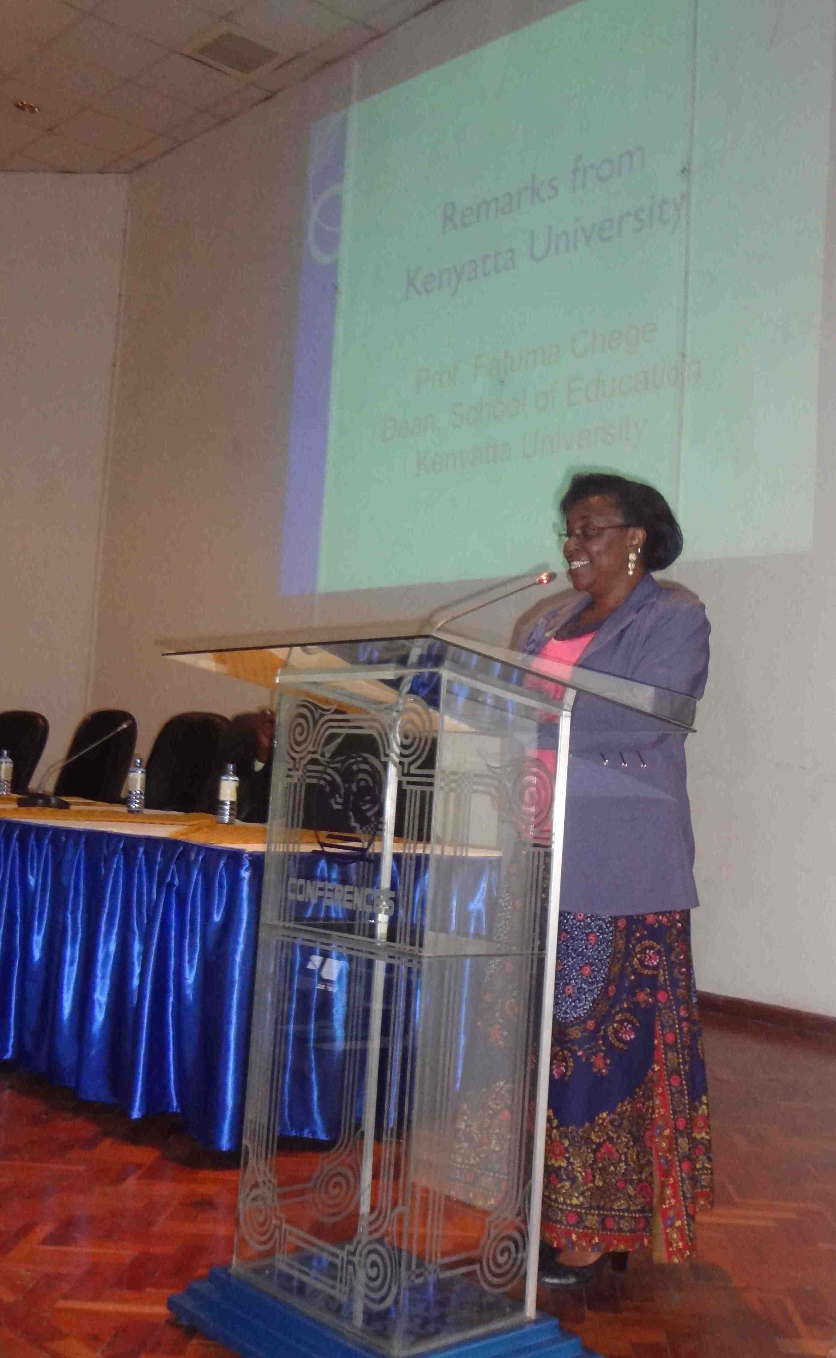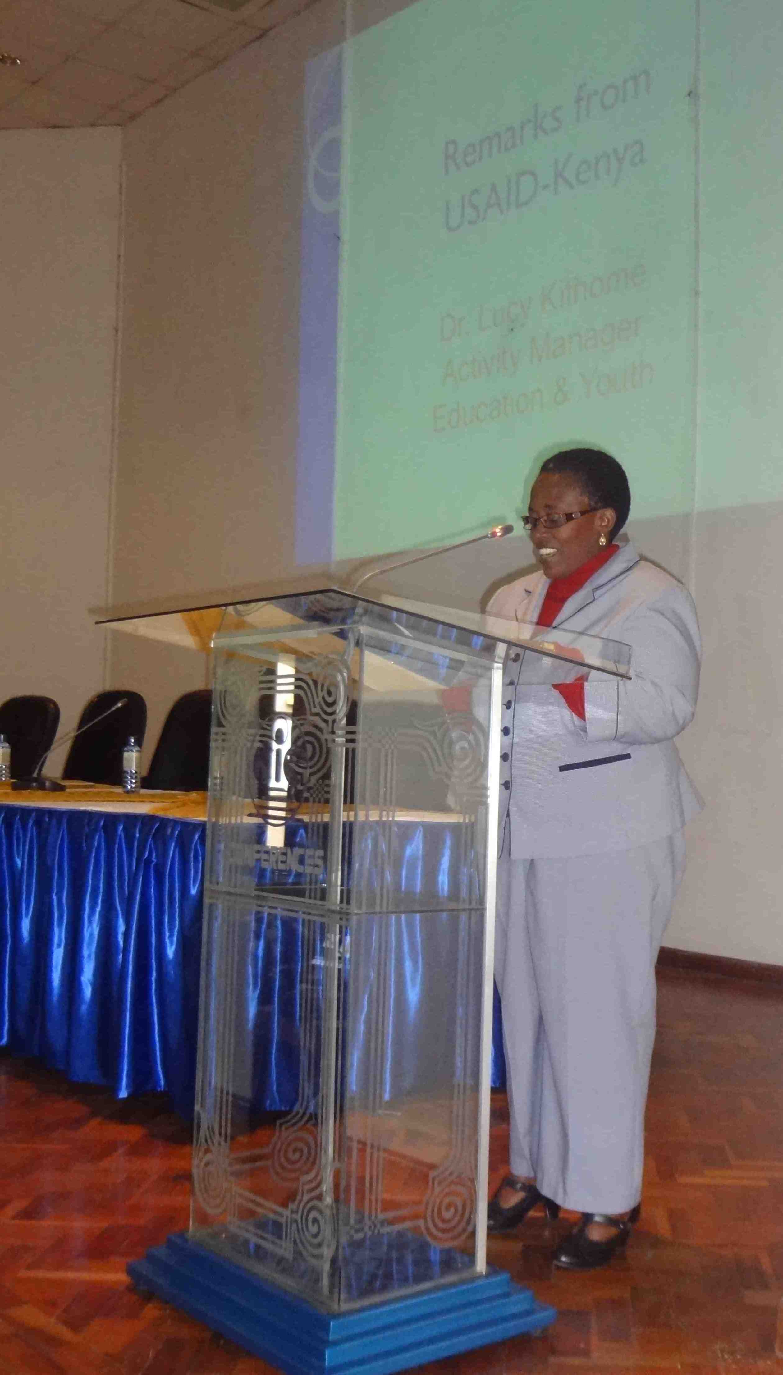 Then we had remarks from some of our stakeholders. Prof. Fatuma Chege, Dean of the School of Education at KU, Mrs. Jacinto Kapiyo, Deputy Director of Education from the Ministry of Education, Science and Technology, and Dr. Lucy Kithome, Activity Manager from Education and Youth at USAID-Kenya each spoke. Additionally, Prof. Jesse Njoka, director of a USAID-funded project at University of Nairobi gave remarks, as did Mr. Dominick Kariuki, Dean of Students from Loretta Secondary School.