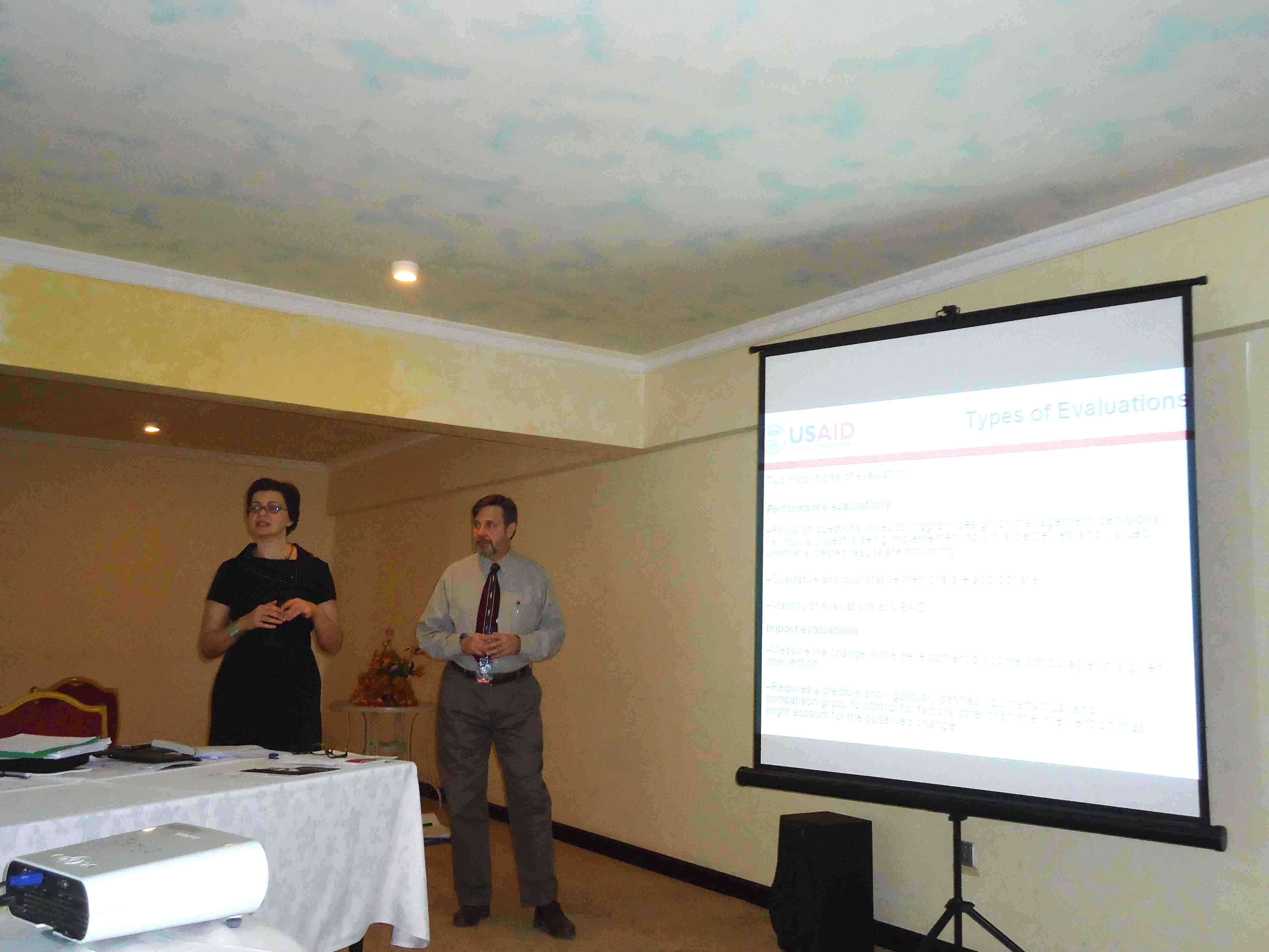 CaptionAzra Nurkic, HED, and Gary Bittner, USAID, discussing monitoring and evaluation in a training meeting with the partnership directors on the last day